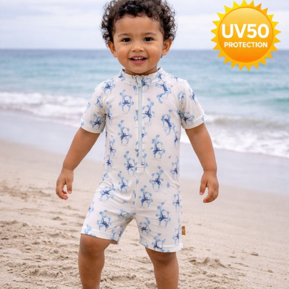UV 50+ защита се грижи за чувствителната детска кожа, за да може детето да играе спокойно под слънцето. Материята е мека, лека и приляга удобно към тялото, без да ограничава движенията.