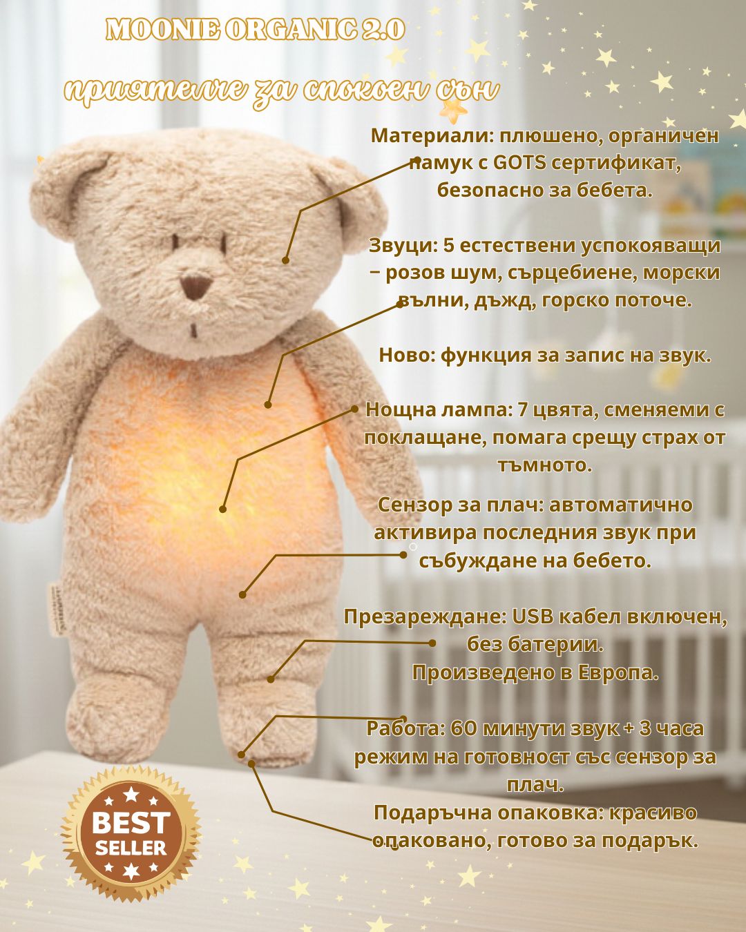 С новата версия Moonie 2.0 вашето бебе ще спи спокойно и ще се чувства сигурно.