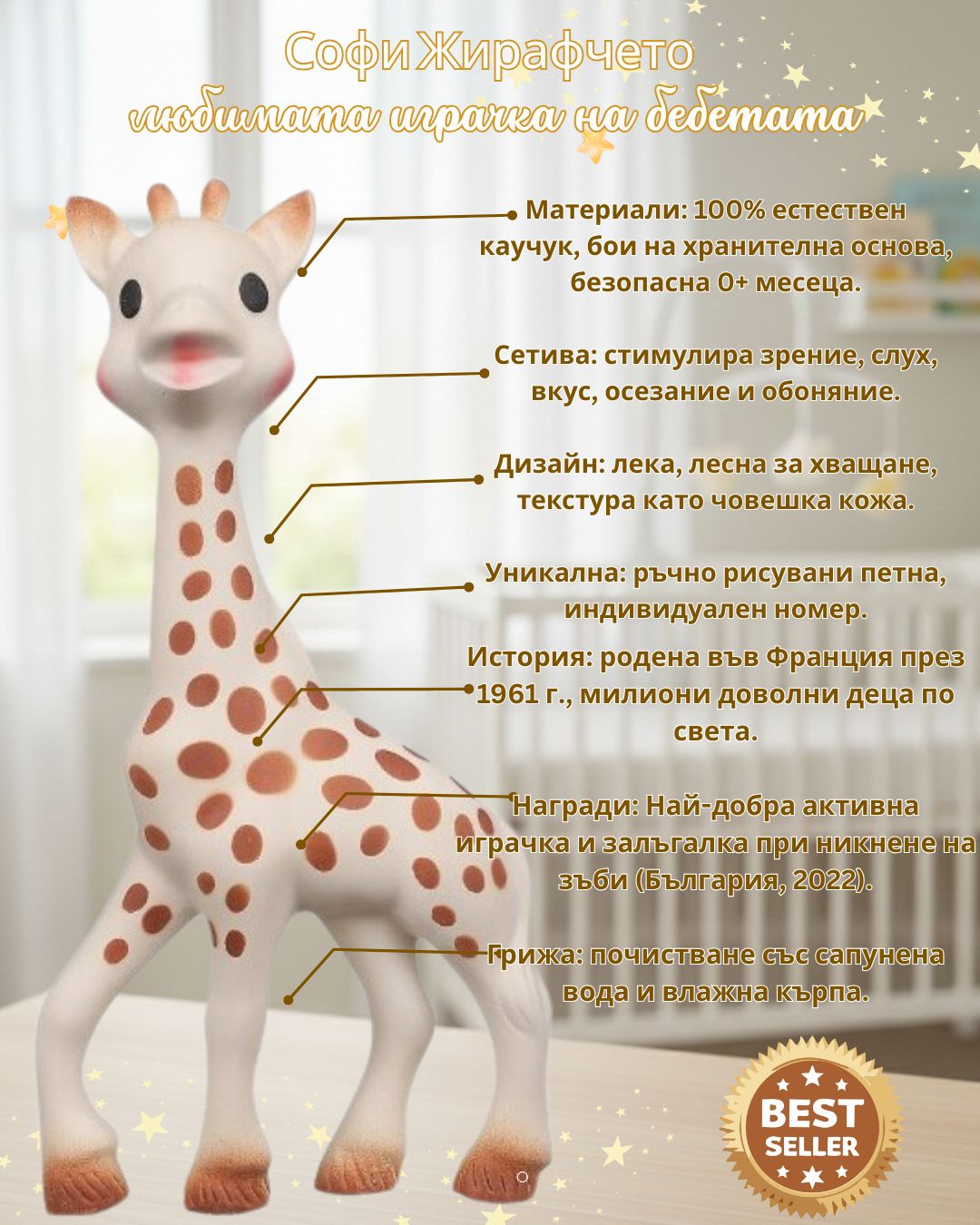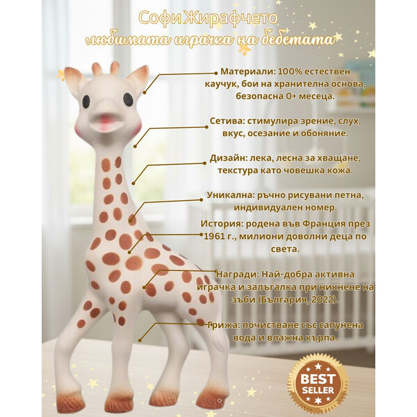 Софи Жирафчето – класика за сетивата. Стимулира зрението, слуха, осезанието, вкуса и обонянието на бебето. Идеална за облекчаване на венците, забавление и развитие на фината моторика. Безопасна, естествена и обичана от поколения.