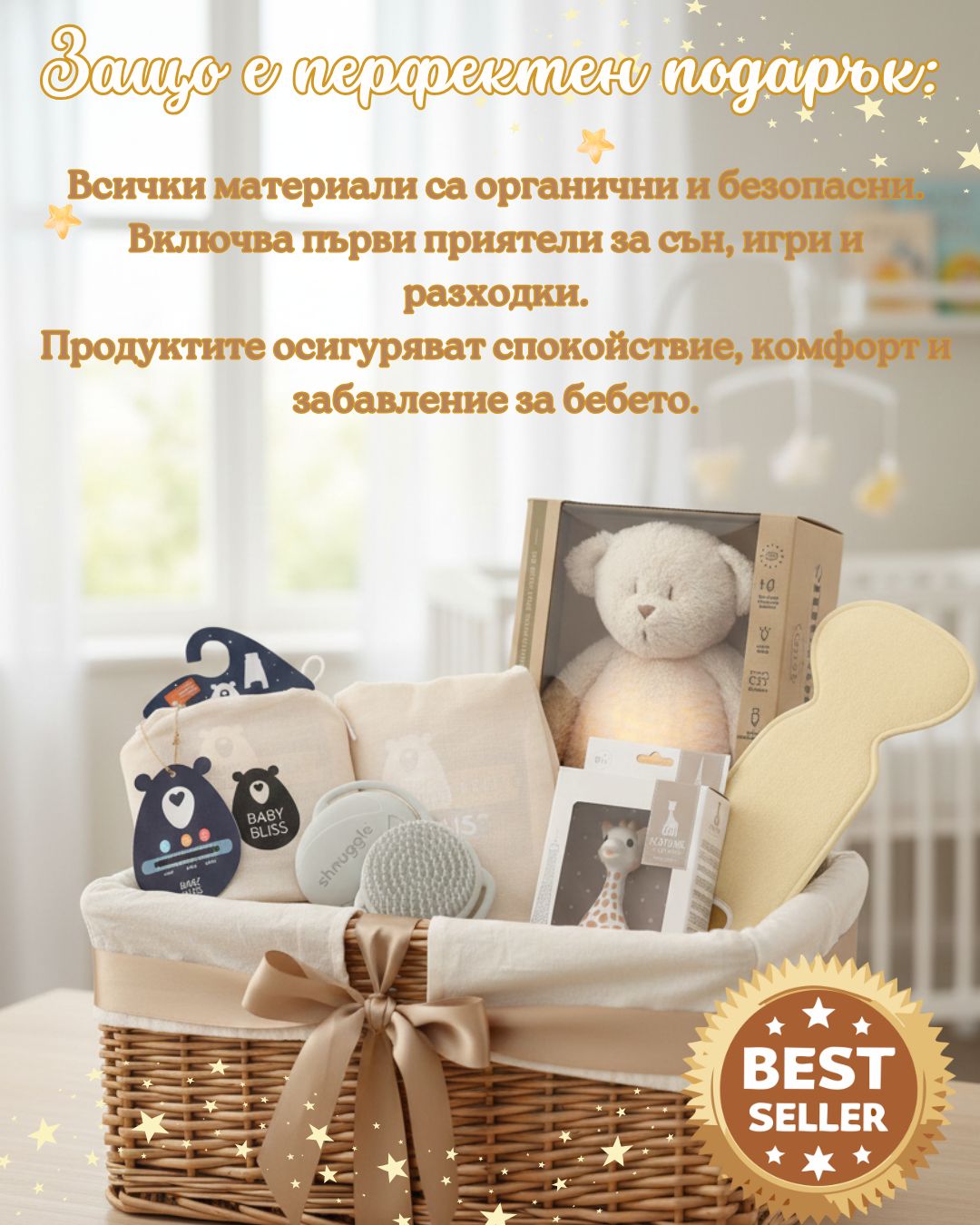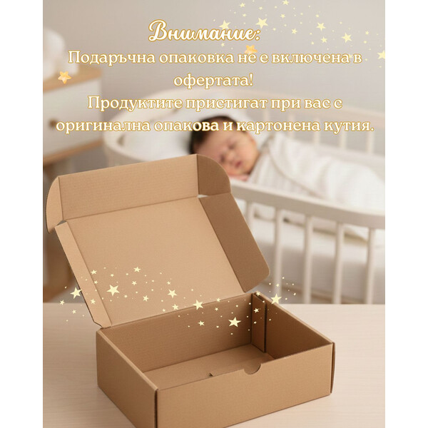 Посрещнете първите дни на вашето бебе с кутия, пълна с внимателно подбрани продукти за спокойствие, комфорт и безопасност. Включва всичко необходимо за щастлив старт – от първите гушкания до първите игри и разходки.
