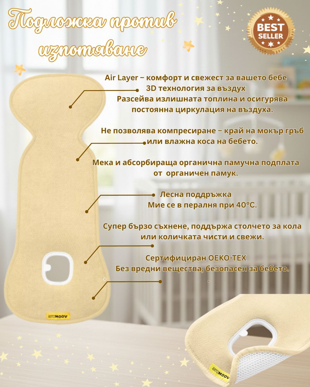 Подложката Aeromoov Air Layer – сухи и свежи на разходка Гарантира комфорт при всяка разходка, като регулира температурата и циркулацията на въздуха около бебето. Няма повече изпотяване или претопляне – само сухо и щастливо бебе, готово за нови приключения.