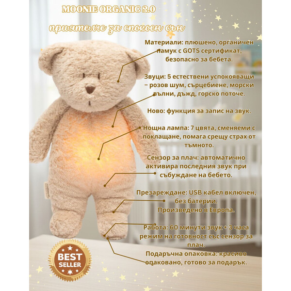 1. MOONIE Organic – Плюшено приятелче за сън ( цвят SAND, освен ако клиентът не е посочил конкертен)