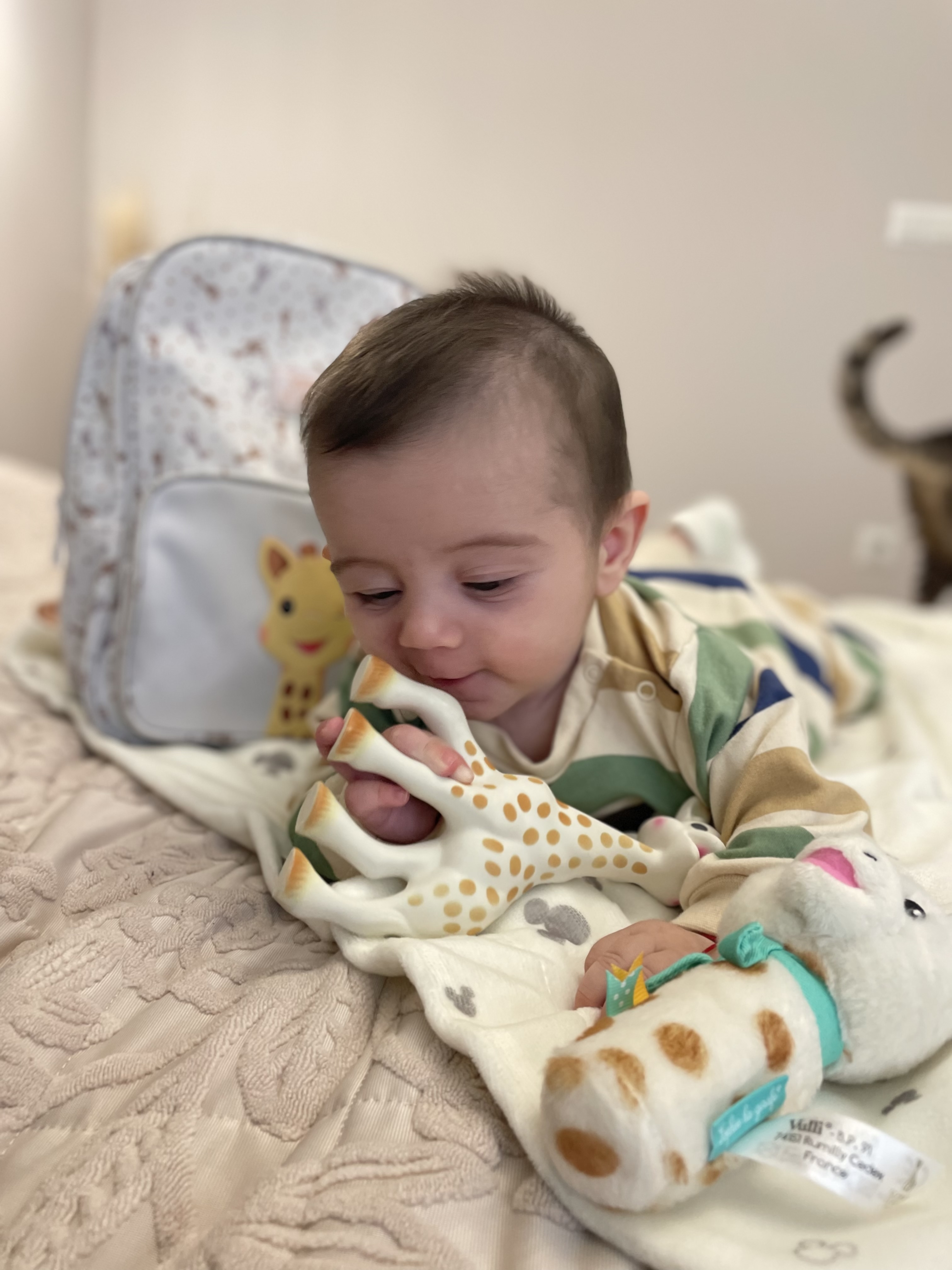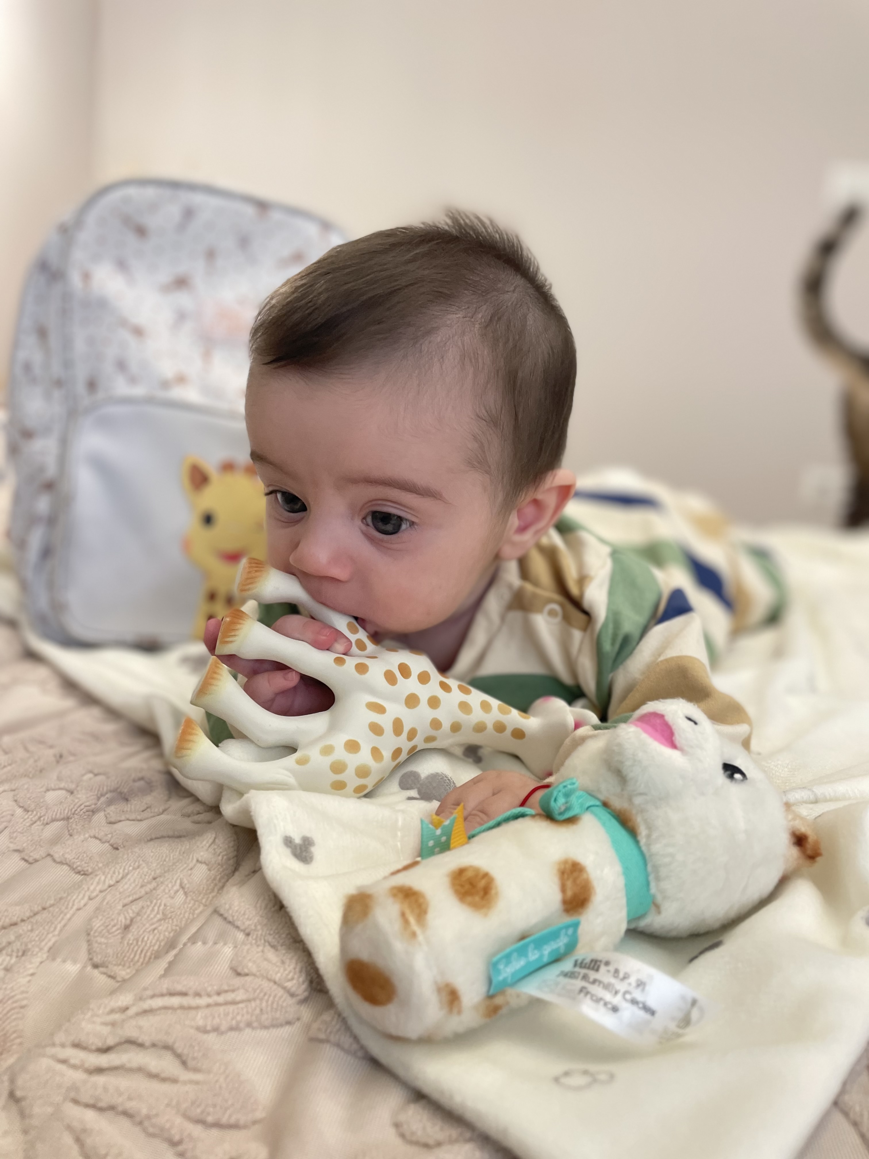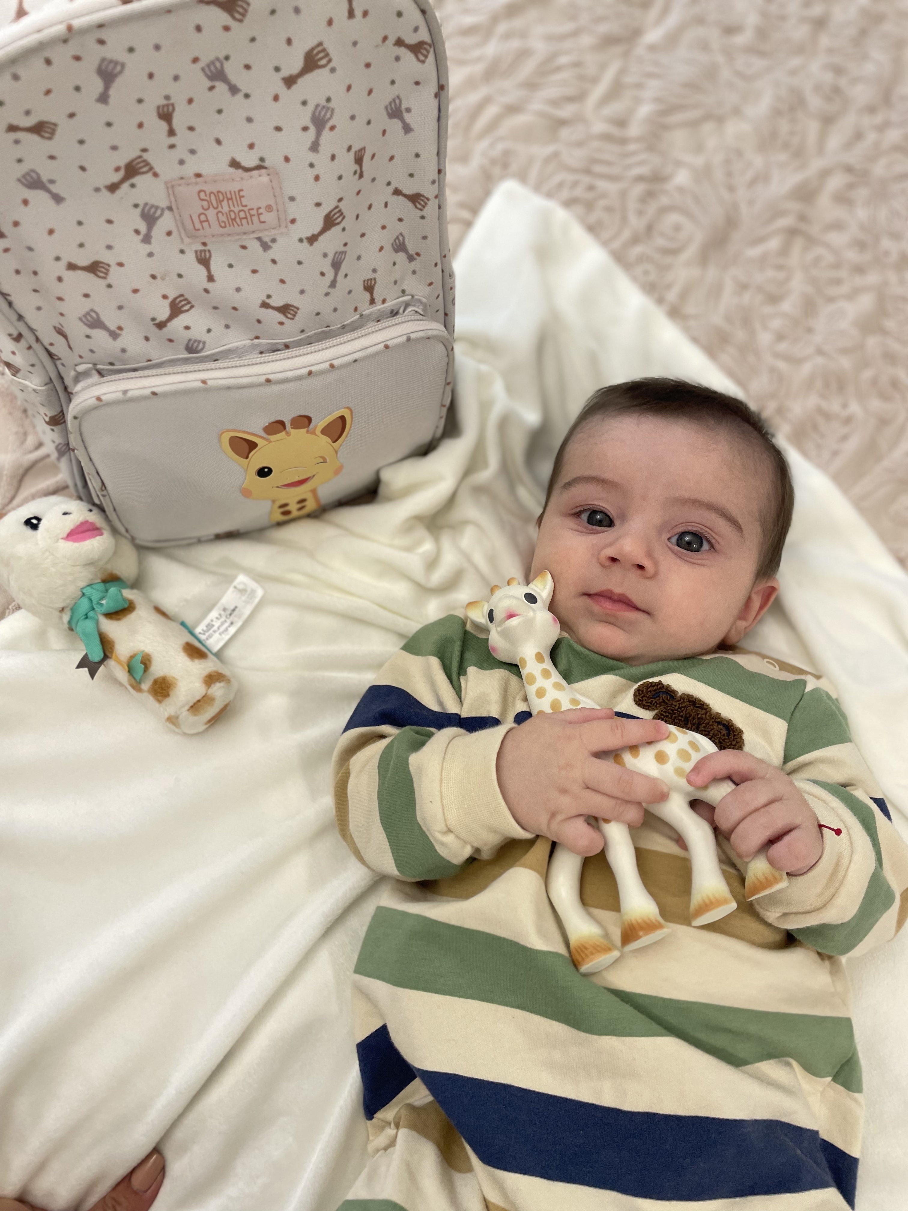 Моят син Никослав, който е на 4 месеца получи гризалката Софи за подарък и веднага щом я видя много я хареса, хвана я с ръчички и започна да я опознава. ☺️❤️