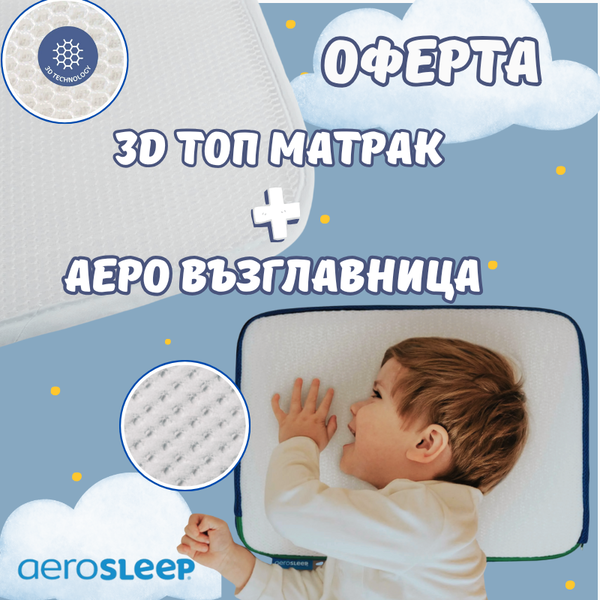 Осигурете на детето си спокоен, здравословен и безопасен сън с комбо пакета AeroSleep, включващ топ матрак и възглавница, проектирани с иновативна 3D технология тип „пчелна пита“. Тази комбинация гарантира идеална хигиена, оптимална въздушна циркулация и адаптивен комфорт, докато вашето дете расте.