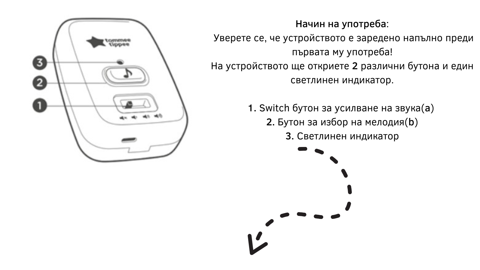 Важно предупреждение: Моля, следвайте указанията за ползване на продукта.Подробни инструкции може да откриете и на tommeetippee.com. Безопасността на вашето дете винаги е ваша отговорност.Проверете всички части на продукта преди употреба. В случай, че установите липса или повреда на някои от частите, преустановете ползването на продукта и се свържете с reia.bg. Плюшени и меки играчки не трябва да се оставят до бебето в леглото. Уверете се, че продуктът е закрепен с текстилна връв извън леглото на бебето и то няма пряк достъп до продукта. За да предотвратите заплитане на продукта около бебето, премахнете играчката от леглото, когато бебето започне да лази и прави опити да се изправя. Не използвайте части и аксесоари, различни от оригиналните включени в оригиналния продукт.