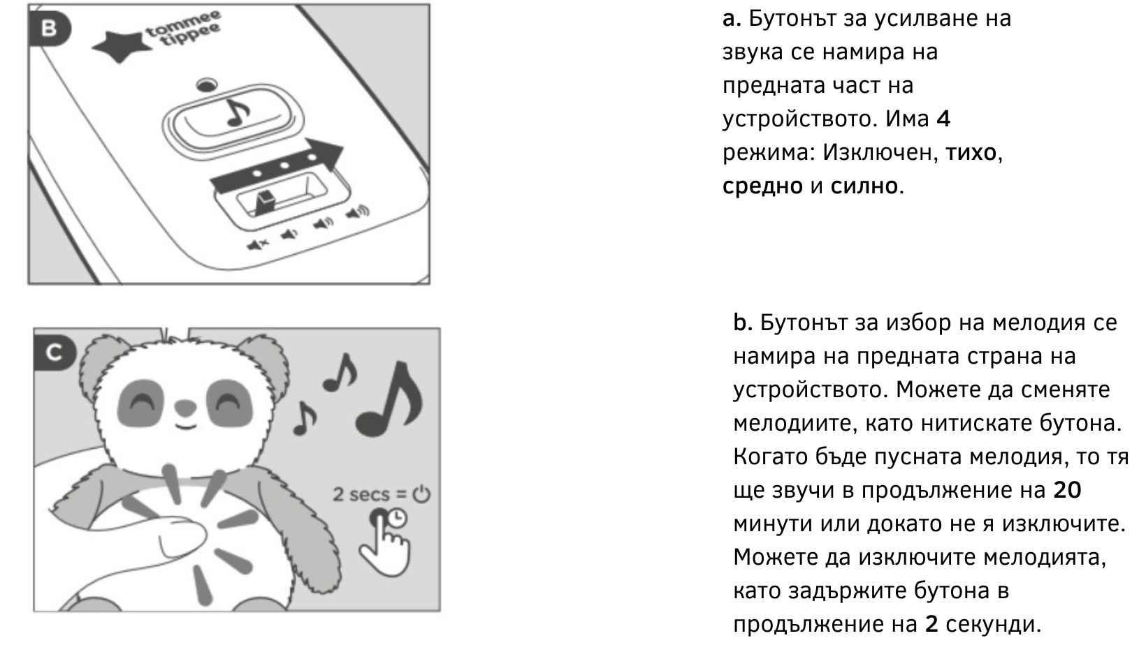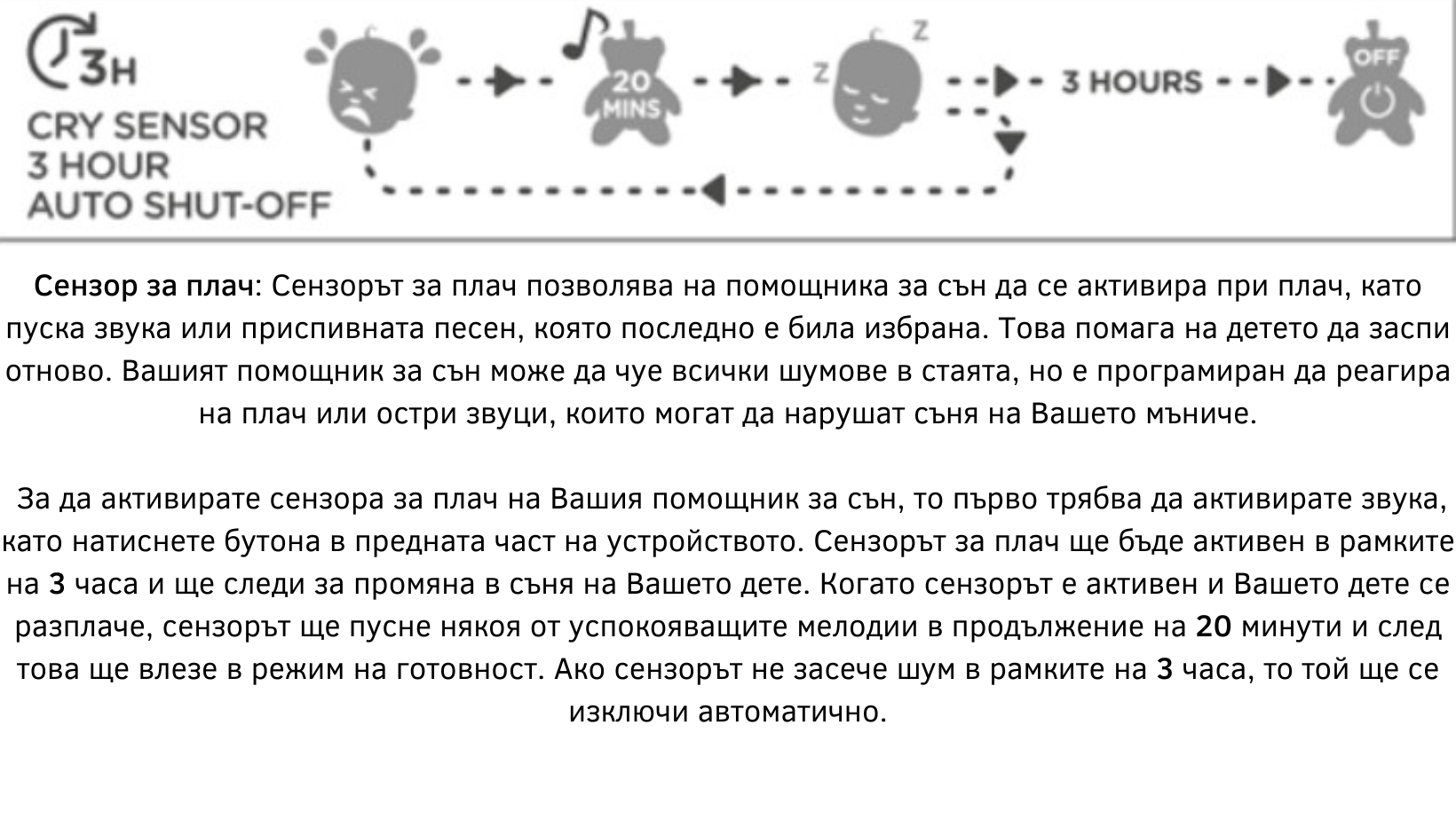 b. Бутонът за избор на мелодия се намира на предната страна на устройството. Можете да сменяте мелодиите, като нитискате бутона. Когато бъде пусната мелодия, то тя ще звучи в продължение на 20 минути или докато не я изключите. Можете да изключите мелодията, като задържите бутона в продължение на 2 секунди. Сензор за плач: Сензорът за плач позволява на помощника за сън да се активира при плач, като пуска звука или приспивната песен, която последно е била избрана. Това помага на детето да заспи отново. Вашият помощник за сън може да чуе всички шумове в стаята, но е програмиран да реагира на плач или остри звуци, които могат да нарушат съня на Вашето мъниче. За да активирате сензора за плач на Вашия помощник за сън, то първо трябва да активирате звука, като натиснете бутона в предната част на устройството. Сензорът за плач ще бъде активен в рамките на 3 часа и ще следи за промяна в съня на Вашето дете. Когато сензорът е активен и Вашето дете се разплаче, сензорът ще пусне някоя от успокояващите мелодии в продължение на 20 минути и след това ще влезе в режим на готовност. Ако сензорът не засече шум в рамките на 3 часа, то той ще се изключи автоматично.