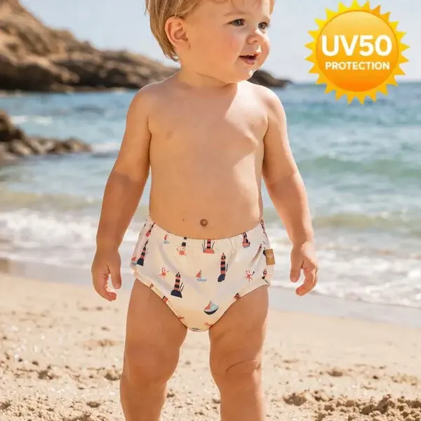 Благодарение на UV защита 50+, чувствителната кожа е ефективно защитена от слънцето, а специалната абсорбираща вътрешна част поддържа детето сухо и комфортно.