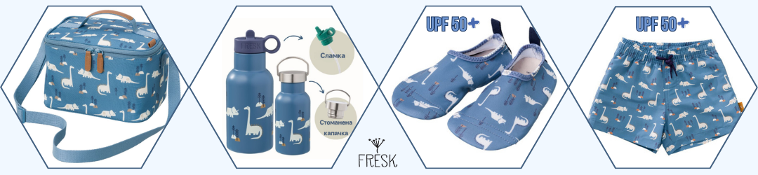 - Състав на материала: Банските на Fresk са изработени основно от рециклиран найлон – издръжлив и мек материал. Тази устойчива материя се използва за създаване на екологични бански за деца и това ги прави еко алтернатива на стандартните бански костюми.