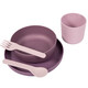 Сетът съдържа чаша, чиния, купичка и прибори за хранене.