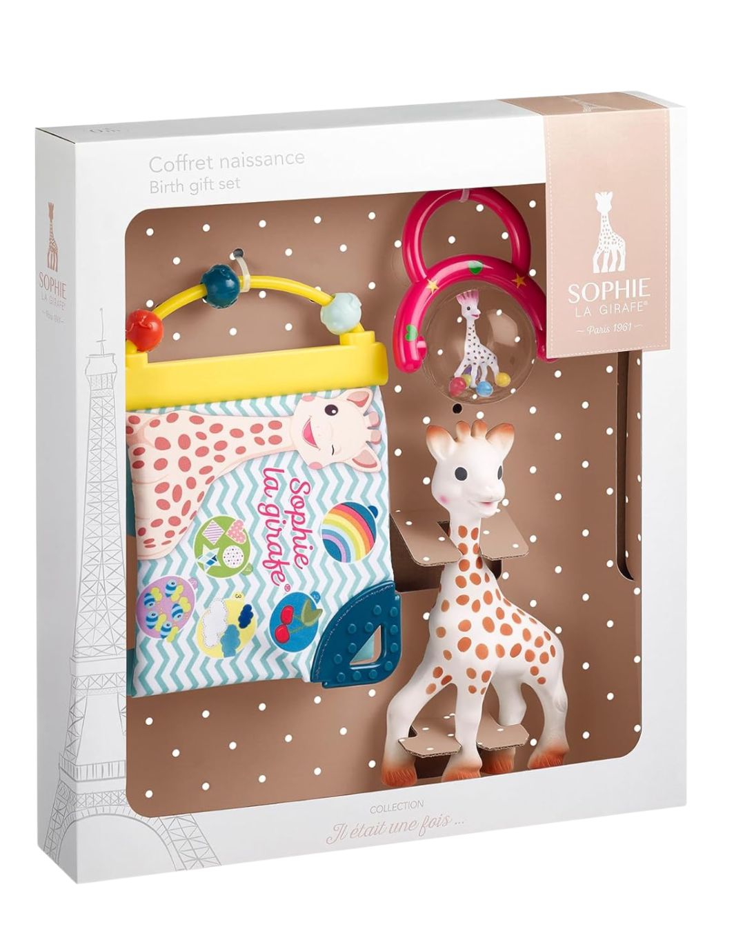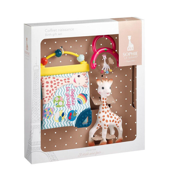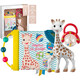 - Известното жирафче Софи, изработено от естествен каучук и натурални оцветители, съпътстващ подарък за всички бебета през последните 50 години! Идеално за игра, облекчаване на никнещите зъбки, меко на допир и издаващо звуци!