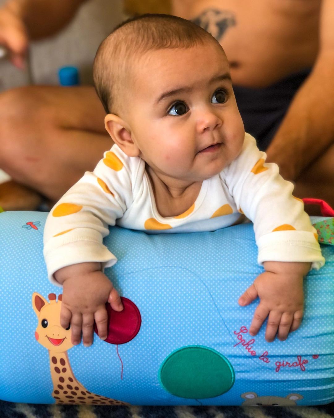 Ярките й цветове ще привлекат вниманието на бебето, различните меки материали ще стимулират допира на бебето, камбанките в топката ще го забавляват, когато играе или разклаща топката! Кръглата й форма е лесна за хващане от малките ръчички! Топката има числа от 1 до 6, които ще му помогнат да научи първите си числа!