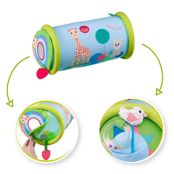 Малки и средни топки подскачат нагоре и надолу около Софи, докато бебето ви играе и разклаща любимата си дрънкалка. Другата страна е мека платнена, щумкаща топка и разбира се бебето ви няма да спре да реагира на звуците на своята играчка.