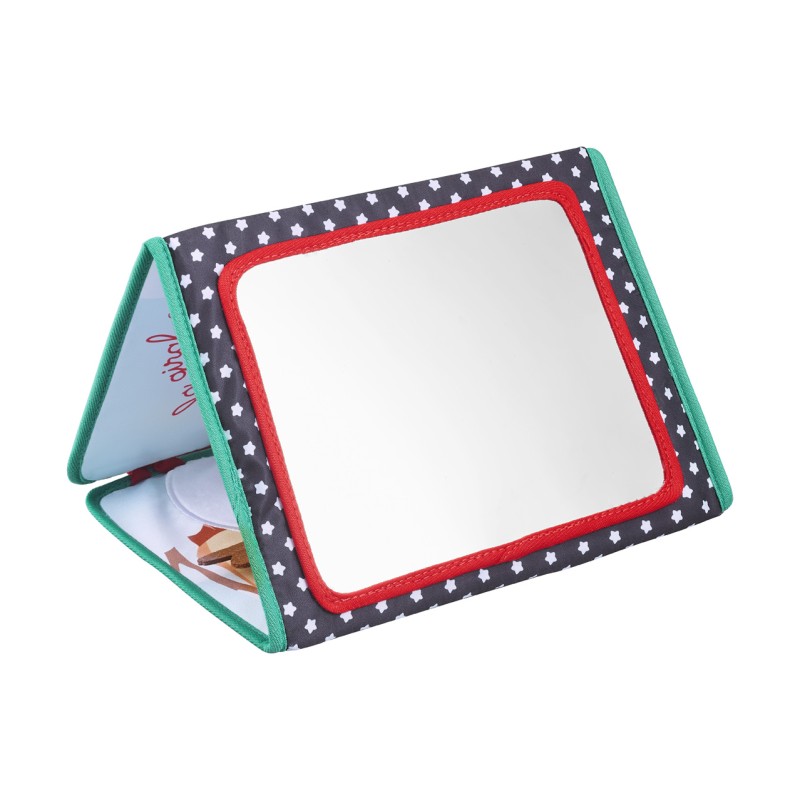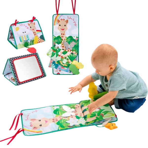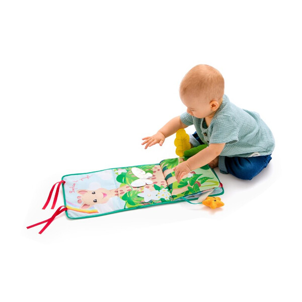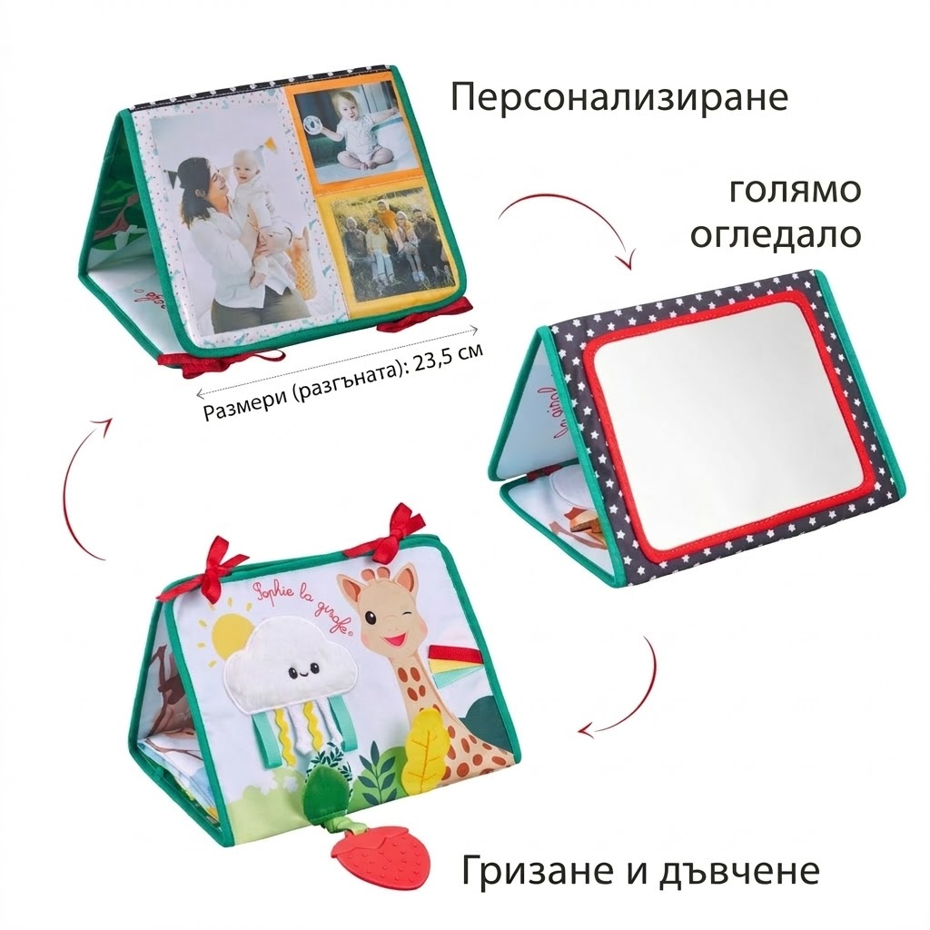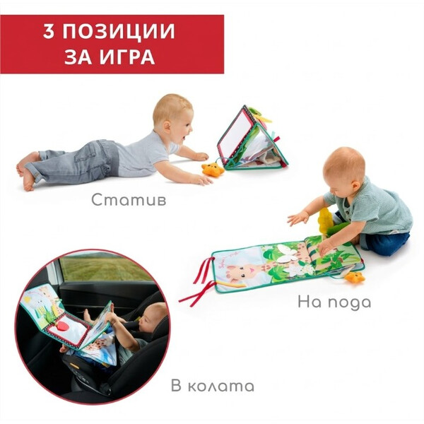 - Позиция „Статив“: Книжката предлага 3 страни за събуждане на сетивата на бебето. Има голямо огледало за откриване на собственото отражение, страна за персонализиране със снимки и цветна, текстурирана страна с етикети, листенца за хващане и дори гризалка за дъвчене!