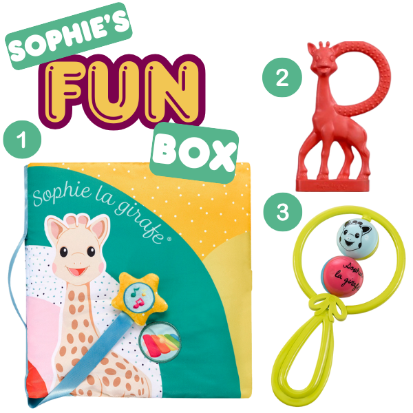 Вътре ще откриеш 3 любими продукта на малките ни приятели, които предлагат много забавления, като в същото време подпомагат развитието, а именно - Софи жирафчето - Голяма интерактивна книга със звуци и мелодии, Класическа дрънкалка с две топчета и Ванилената гризалка на Софи.