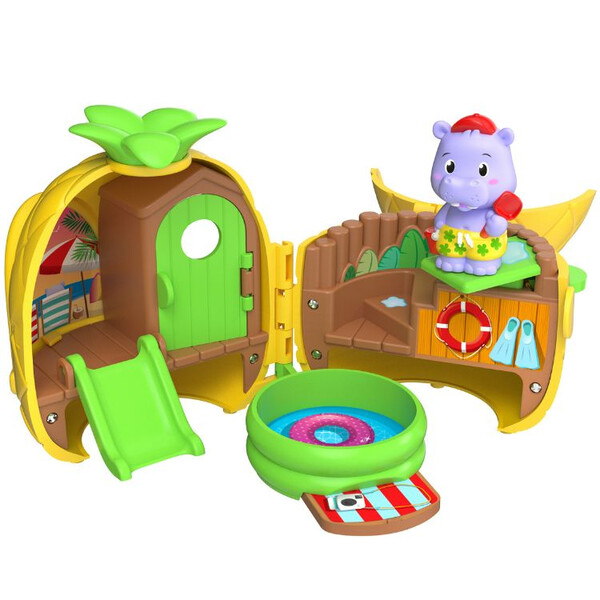 Басейнът се отваря с едно натискане и героят се плъзга по пързалката за още повече забавление.