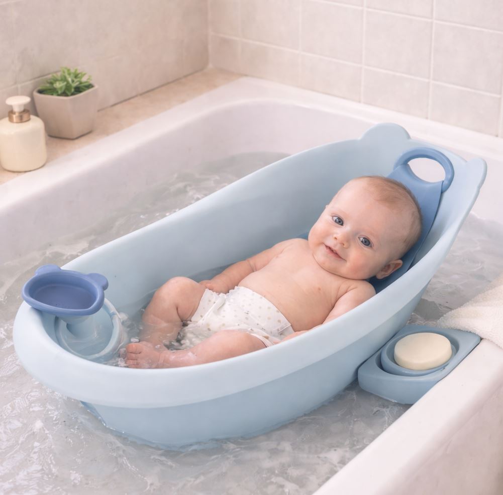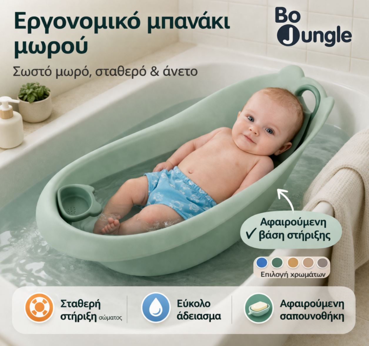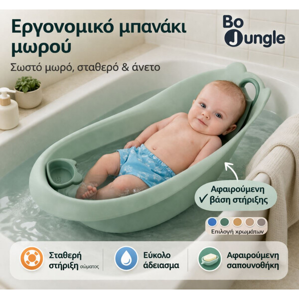 С ергономичната вана на Bo Jungle, къпането става лесно за вас и приятно за вашето бебе — още от първия ден.