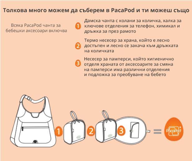- включва 2 отделни чанти за нуждите на вашето бебе: термо чанта за храната, която отговаря на всички спецификации, и чанта с подложка за повиване и място за козметика.