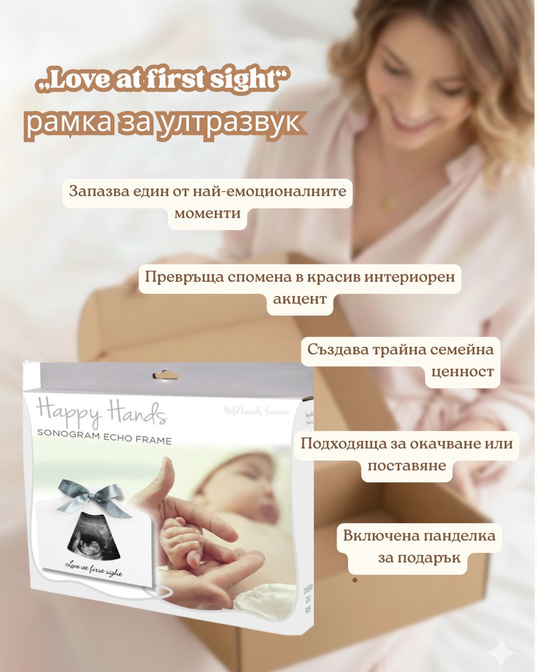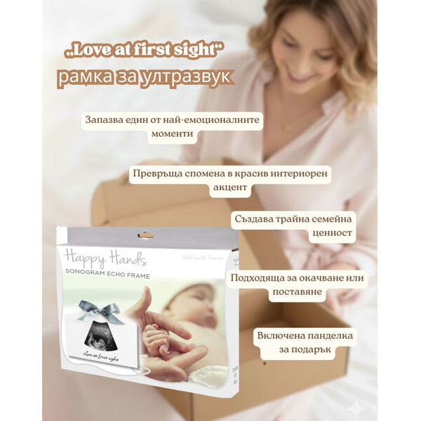 Тази нежна рамка е идеална за ултразвукова снимка и носи посланието „Любов от пръв поглед“. Прекрасен и емоционален акцент за дома или мил начин да споделите щастливата новина с близките.