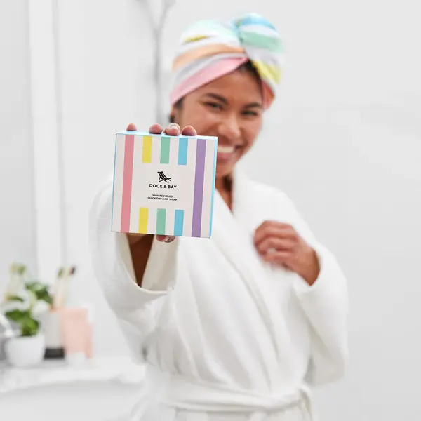 Тюрбанът изсушава косата до 3 пъти по-бързо от стандартна кърпа, без да я наелектризира и без излишно триене. Изработен е от 100% рециклирани материали и е толкова лек, че няма да усещате тежест или напрежение във врата.