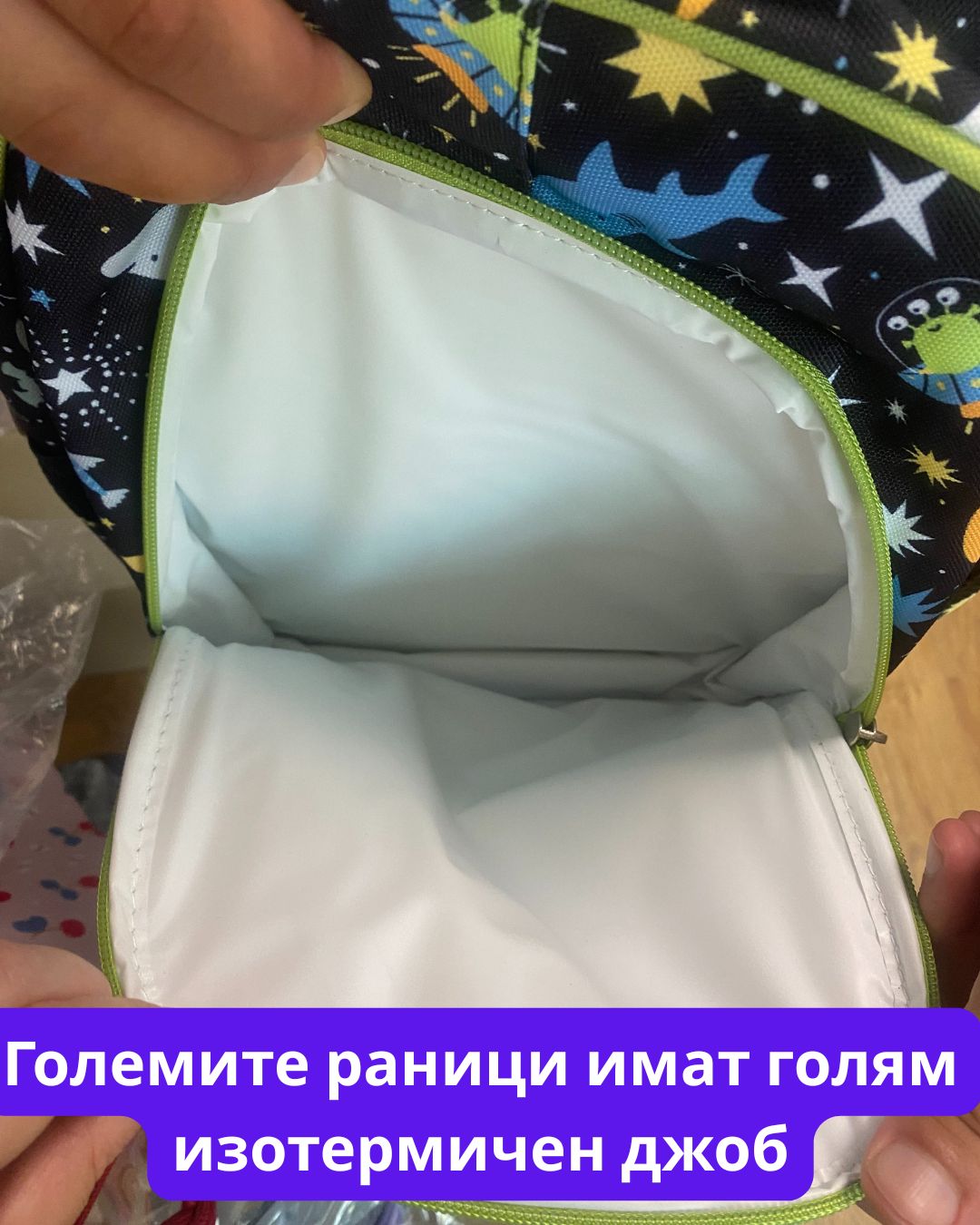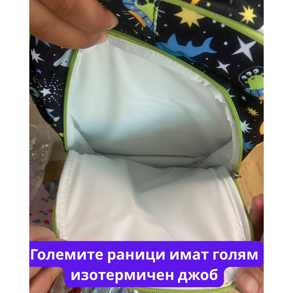 - Преден джоб с изотермична подплата за запазване на закуските в правилната температура