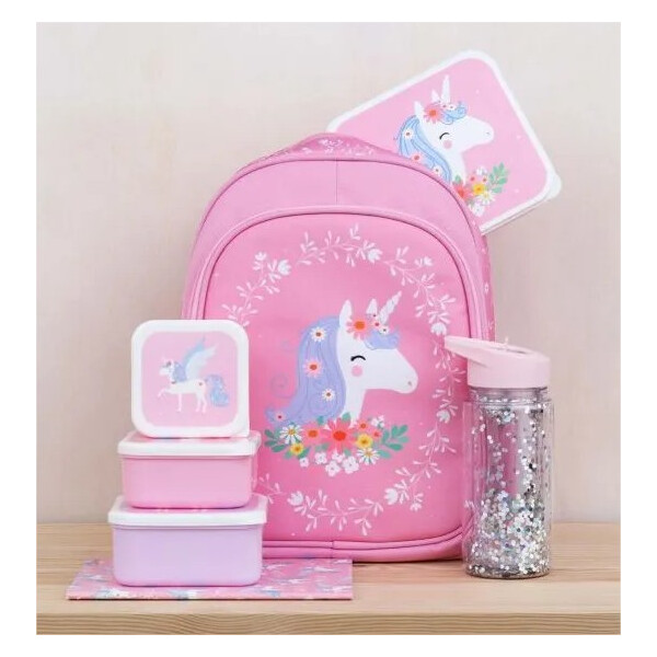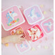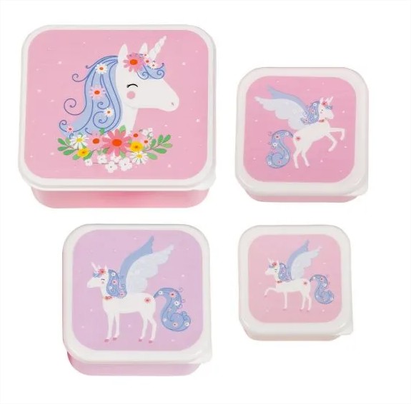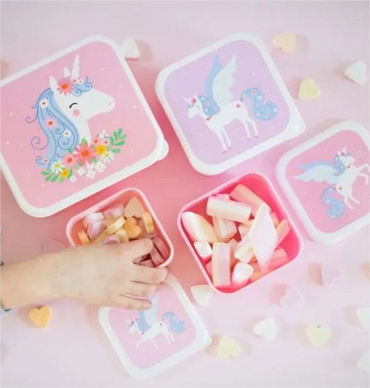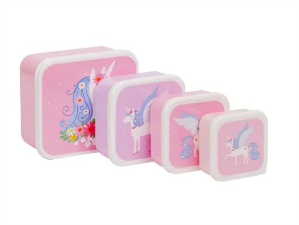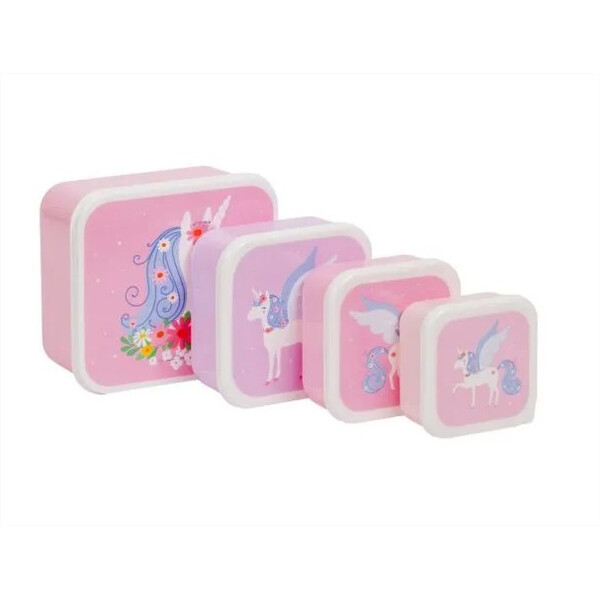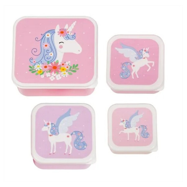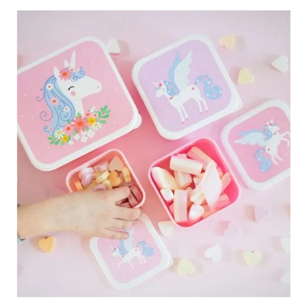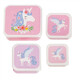 Запазете храната си свежа в този комплект кутии с тема "Еднорог". Плодове, зеленчуци, бисквитки, бонбони, сандвичи.. Всички те лесно могат да се поберат в една от тези кутии. Този сладък комплект за храна включва четири броя кутии с различен размер с уникален дизайн. Страхотни за училищни обеди и закуски в движение, например разходка в планината.