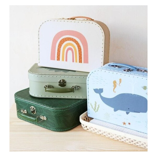 И големият, и малкият куфар са с цветна метална дръжка и закопчалка, която ще пази всички съкровища на вашето мъниче в безопасност.