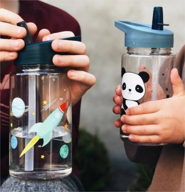 - Бутилки и термоси за вода (включително модели с вградена сламка или устник) от марки като Fresk и A Little Lovely Company