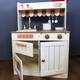 Разполага с две котлончета, мивка с чешма, фурна, голям шкаф, рафт за допълнително съхранение и кукички за закачане на готварски аксесоари!