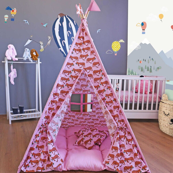 Изработени от естествени материали, със здрава дървена рамка, памучни тъкани и изключително дебела и пухкава основна възглавница създават най-топлото убежище за въображението на Вашето дете. Да не забравяме и другите две възглавници, едната в квадратна, а другата във формата на звезда, за почивка или пък.. за бой с възглавници!