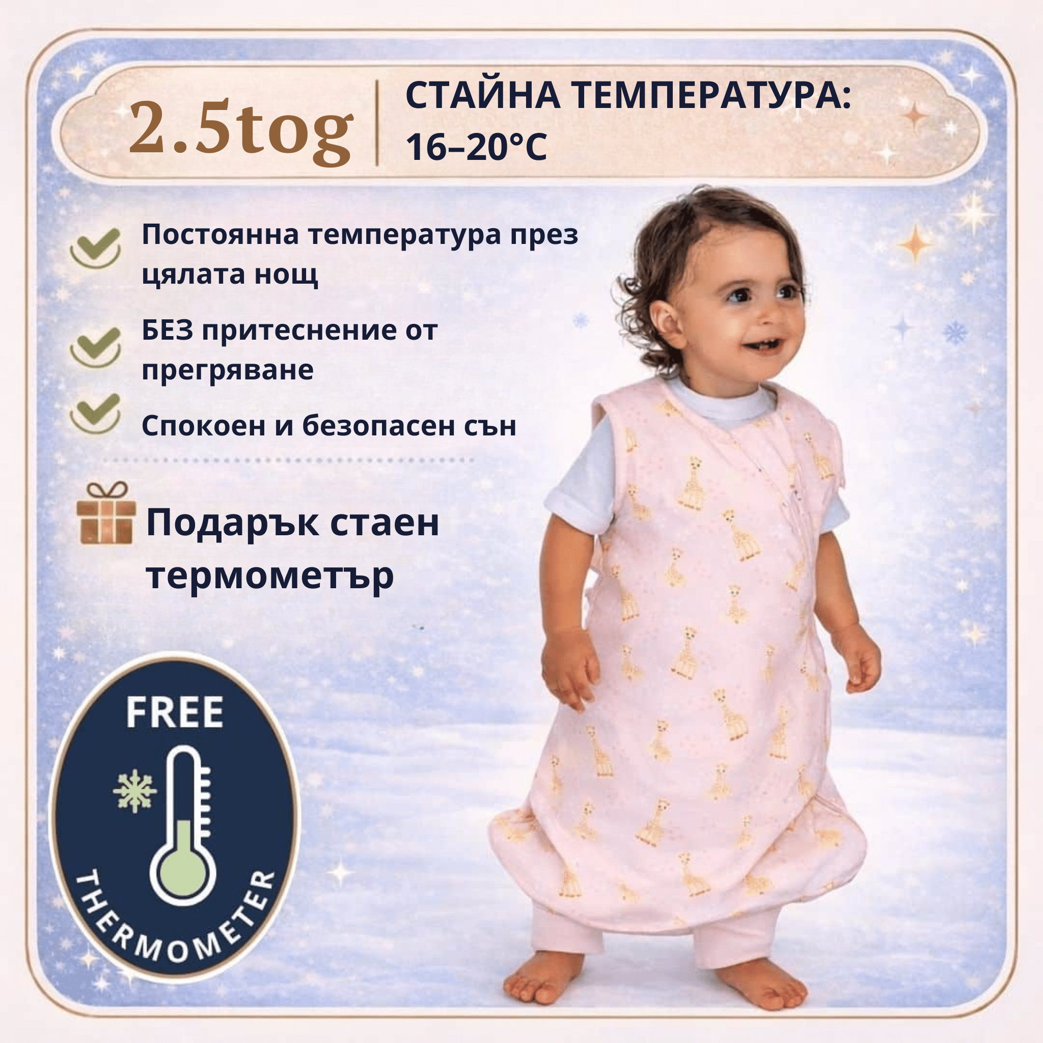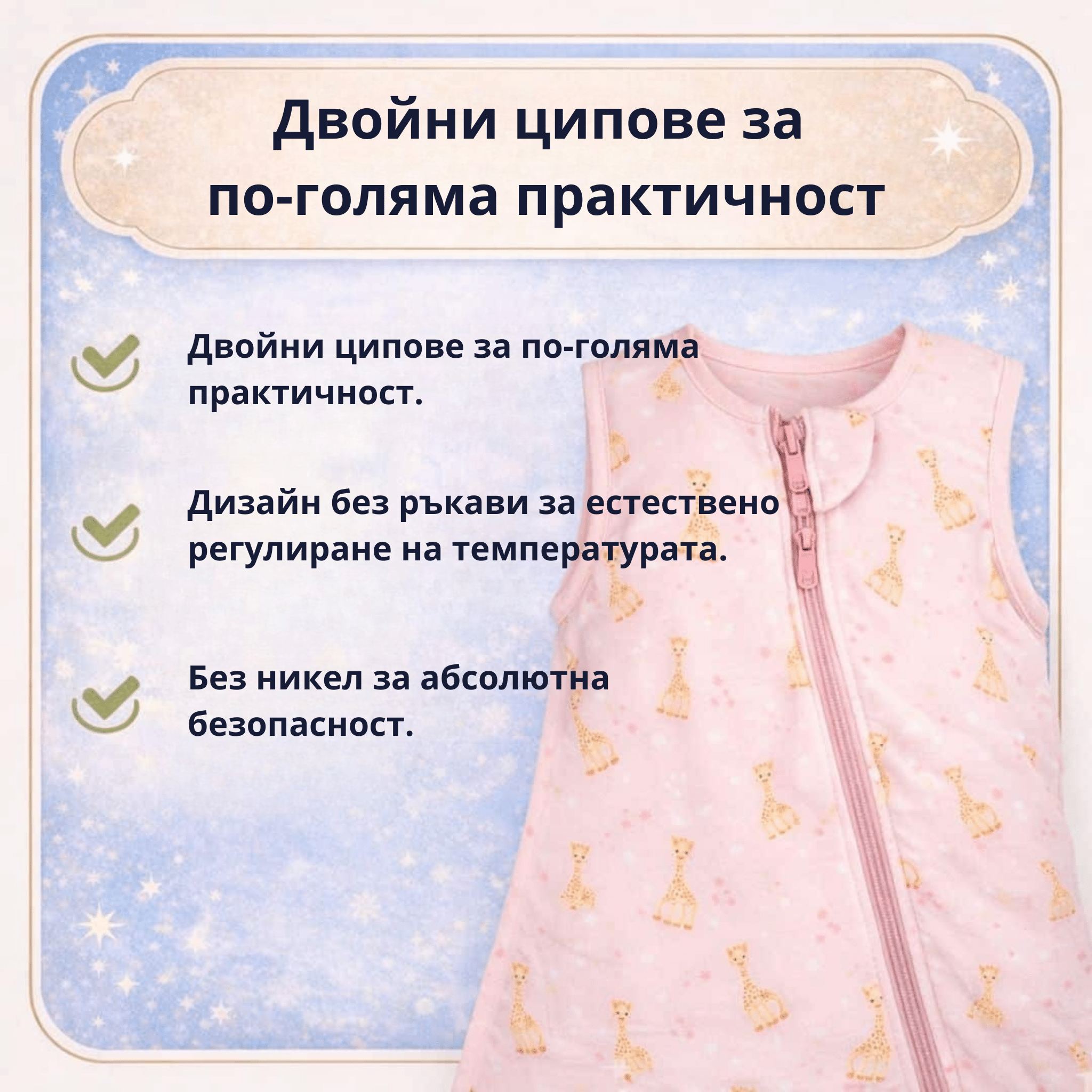 В сътрудничество с Жирафчето Софи - един от най-обичаните бебешки брандове в света - BabyBliss създаде BlissJump - спален чувал, който съчетава безопасност, комфорт и пълна свобода на движение.