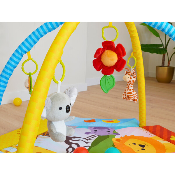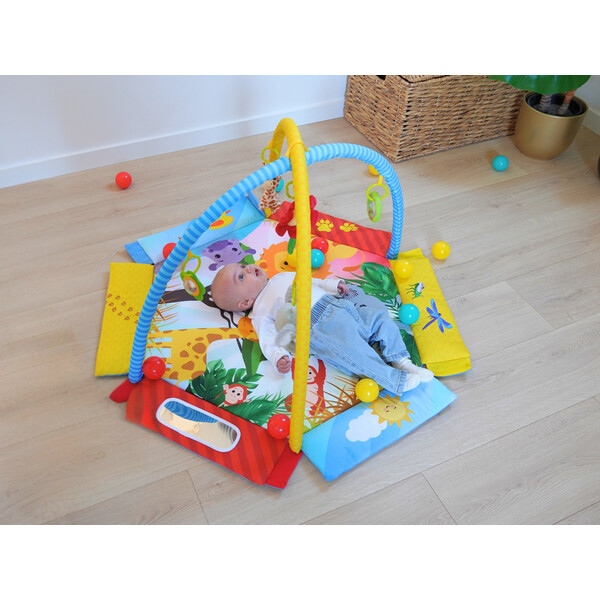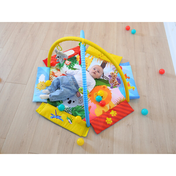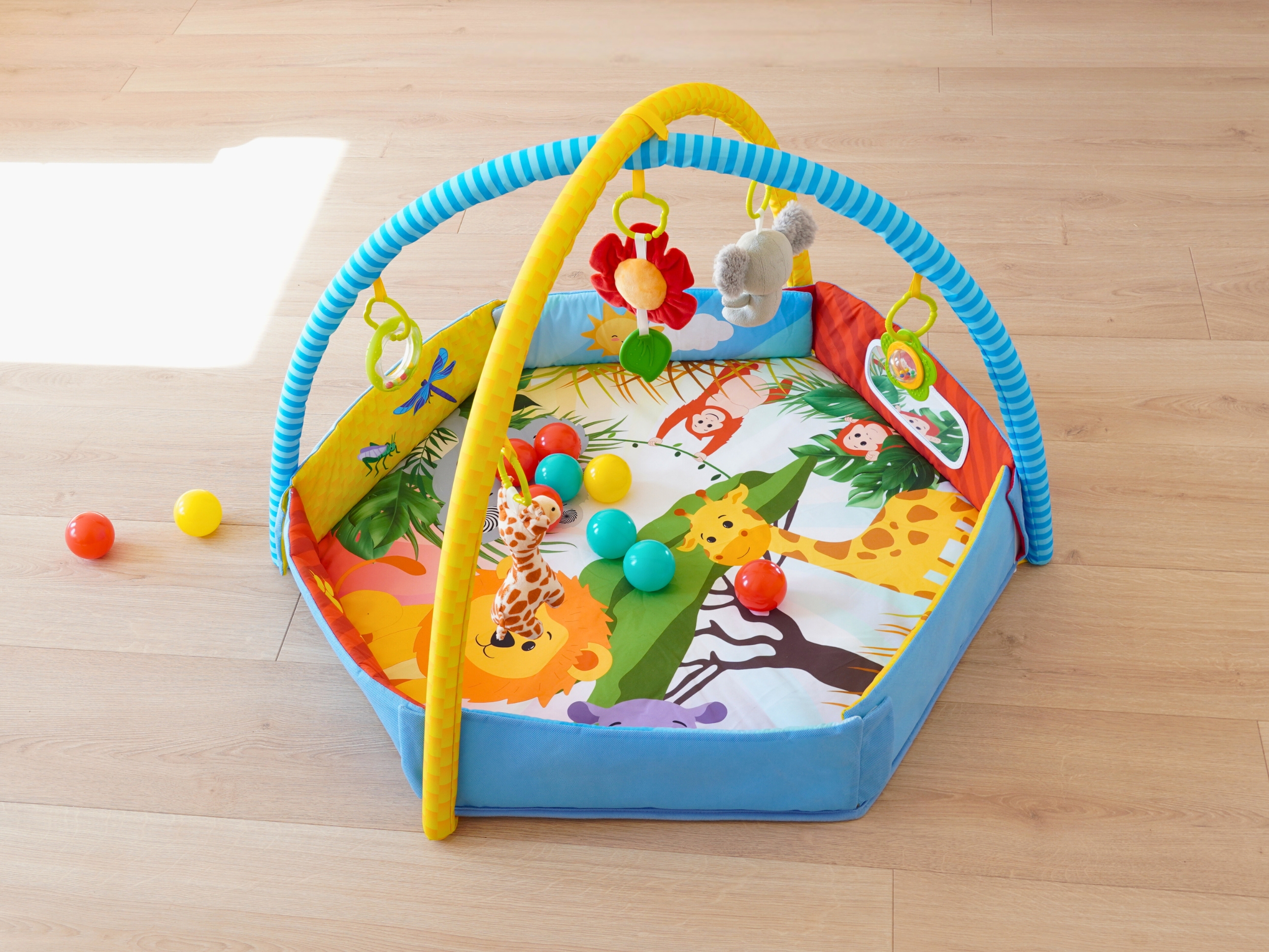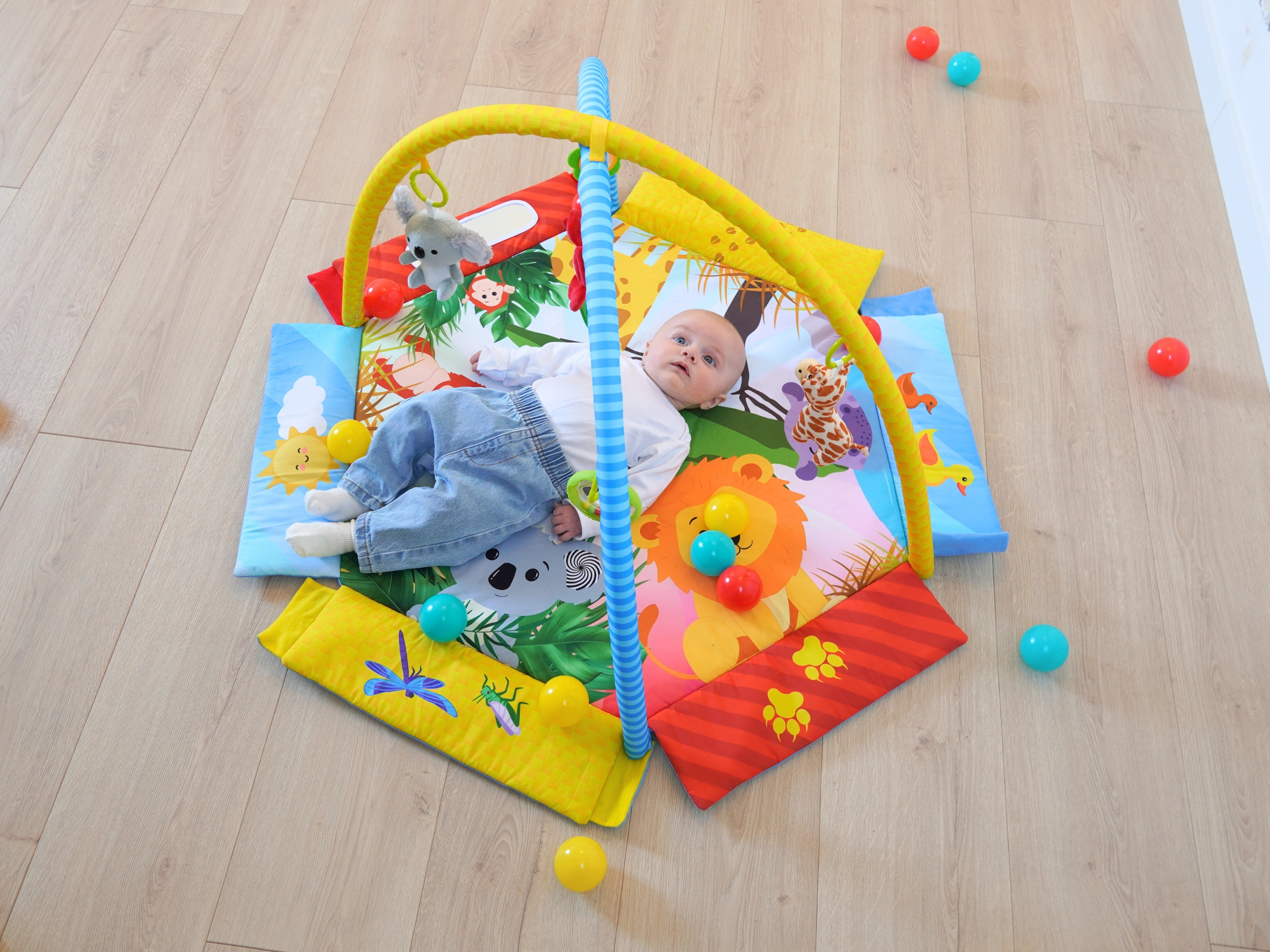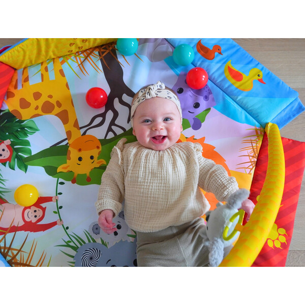 С мек и безопасен дизайн, красиви цветове и 30 цветни топки, вашето бебе ще се забавлява, ще се движи и ще развива уменията си чрез игра. Гимнастиката лесно се трансформира в басейн с топки или в занимателен активити килим.