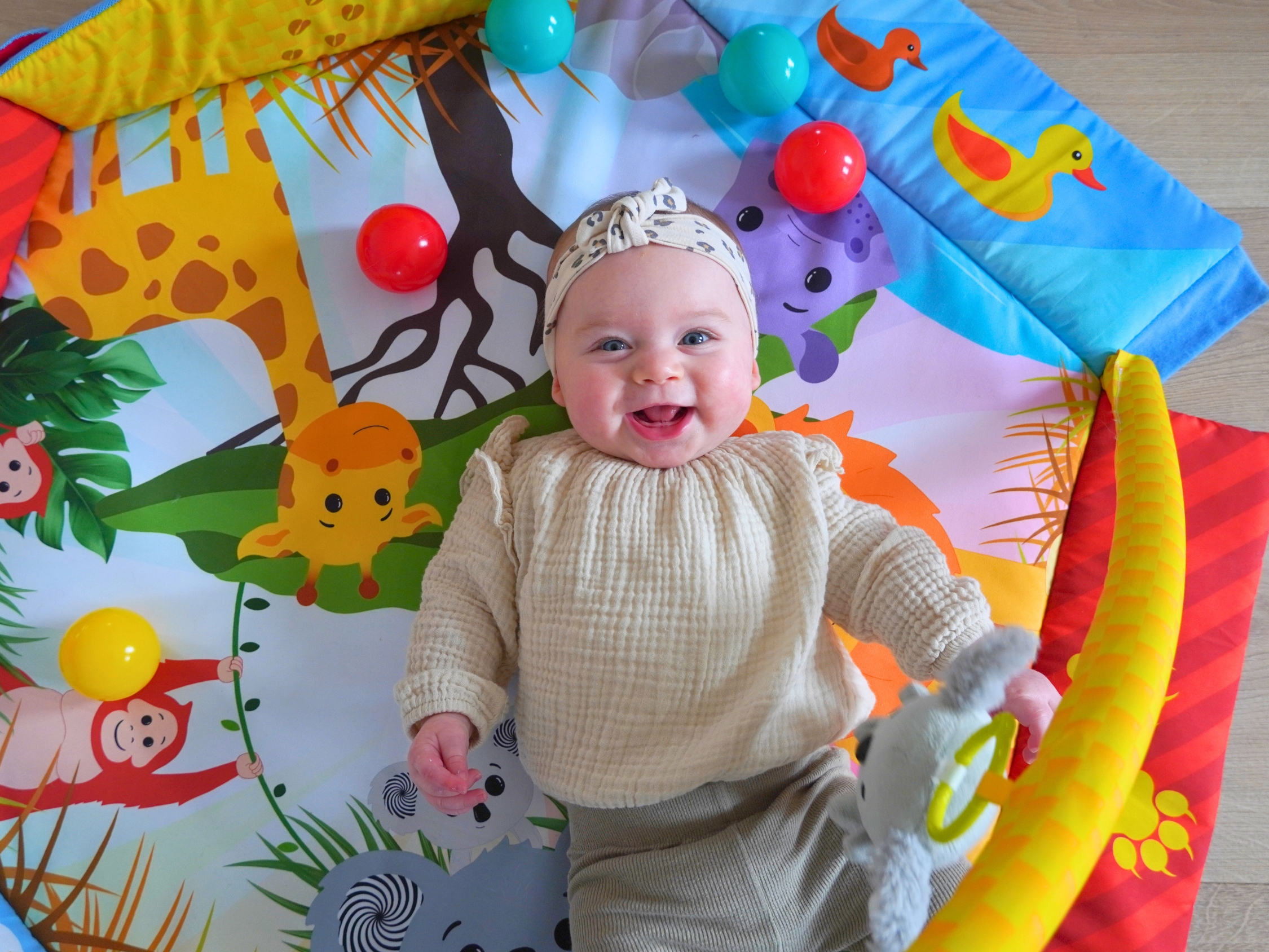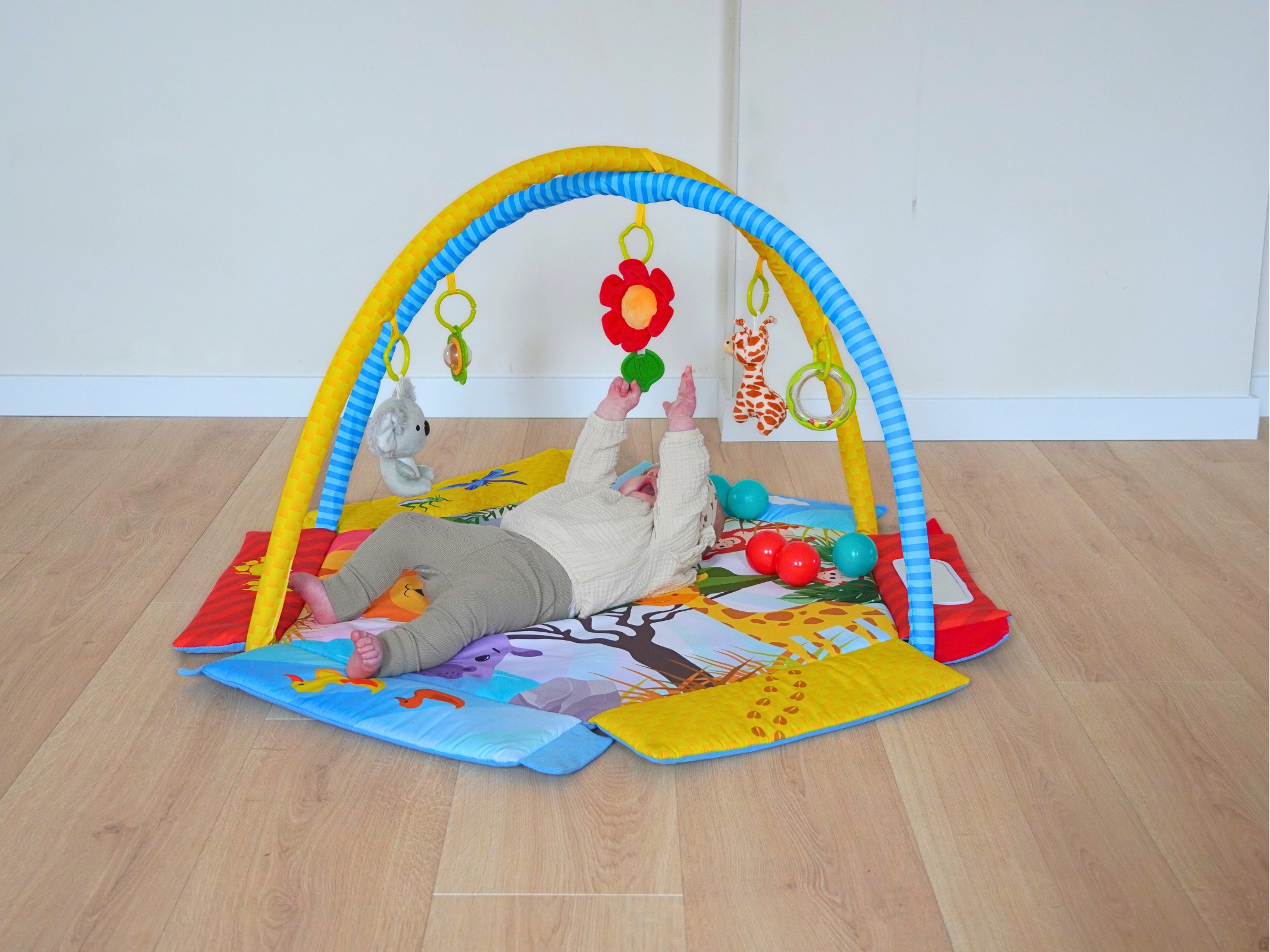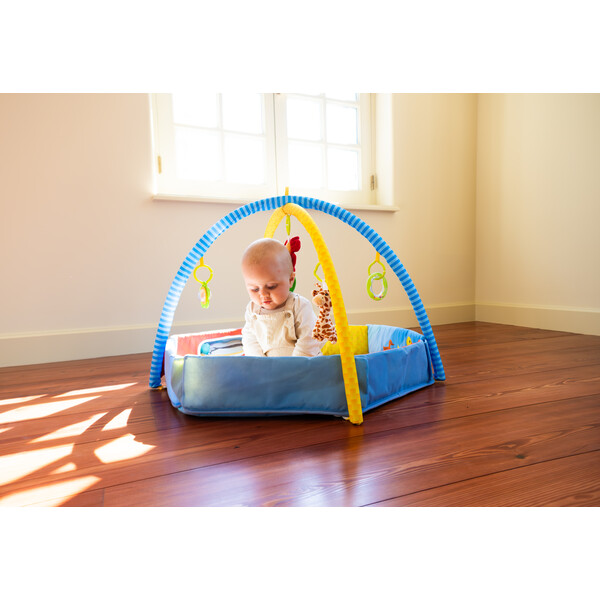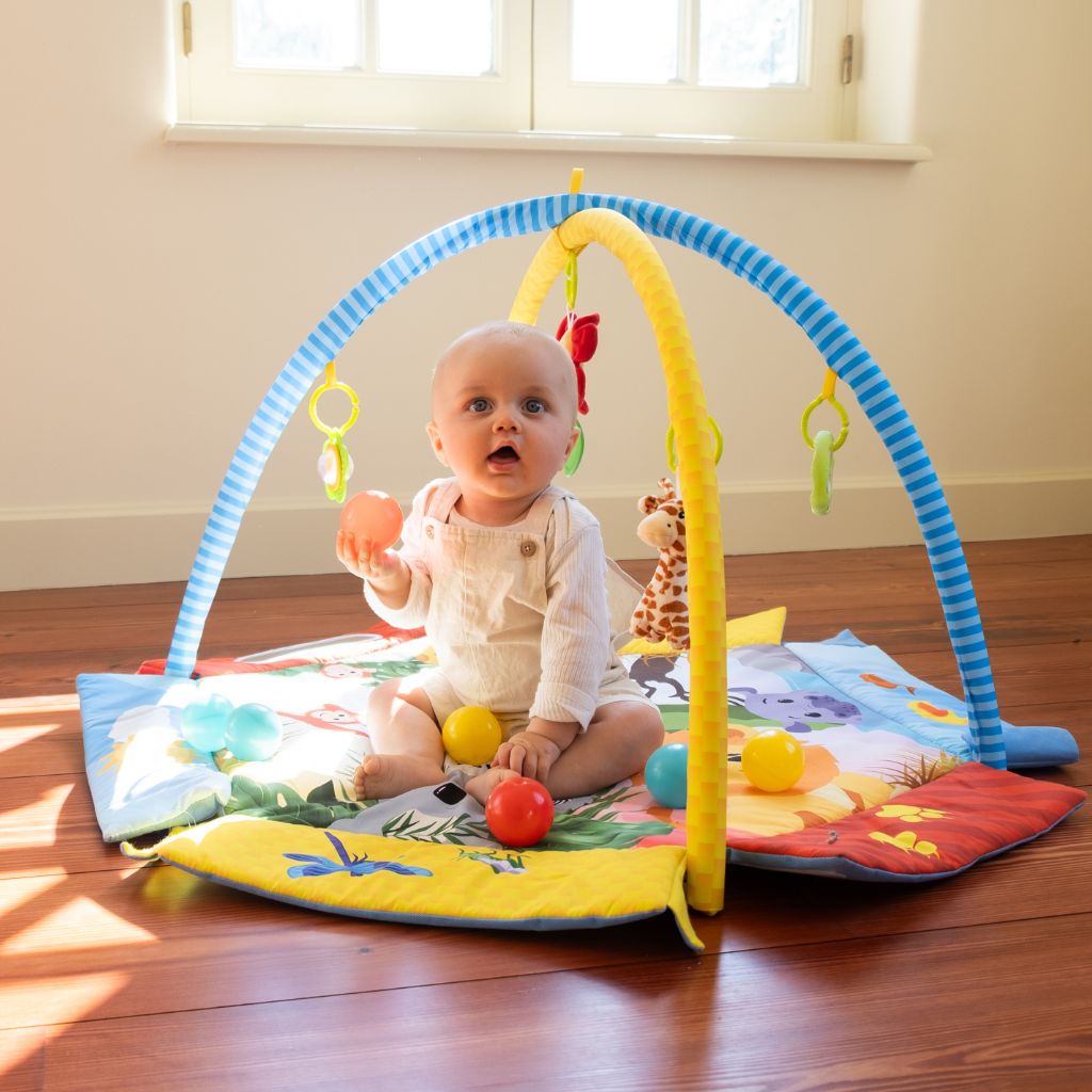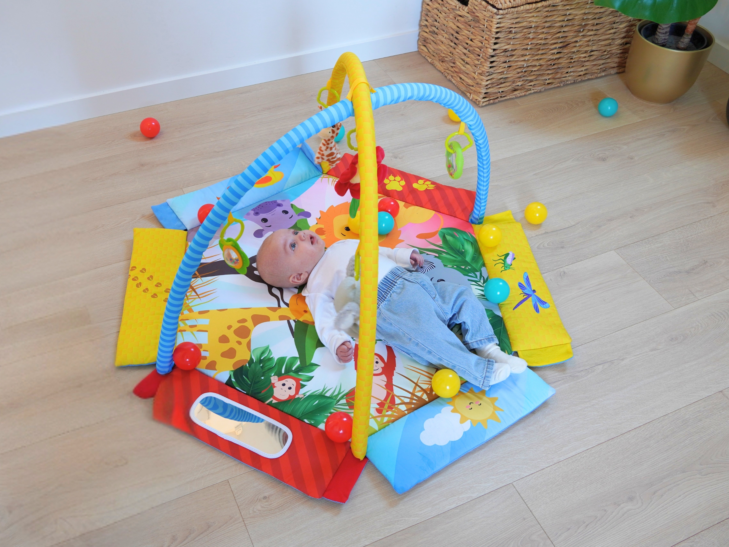 С мек и безопасен дизайн, красиви цветове и 30 цветни топки, вашето бебе ще се забавлява, ще се движи и ще развива уменията си чрез игра. Гимнастиката лесно се трансформира в басейн с топки или в занимателен активити килим.