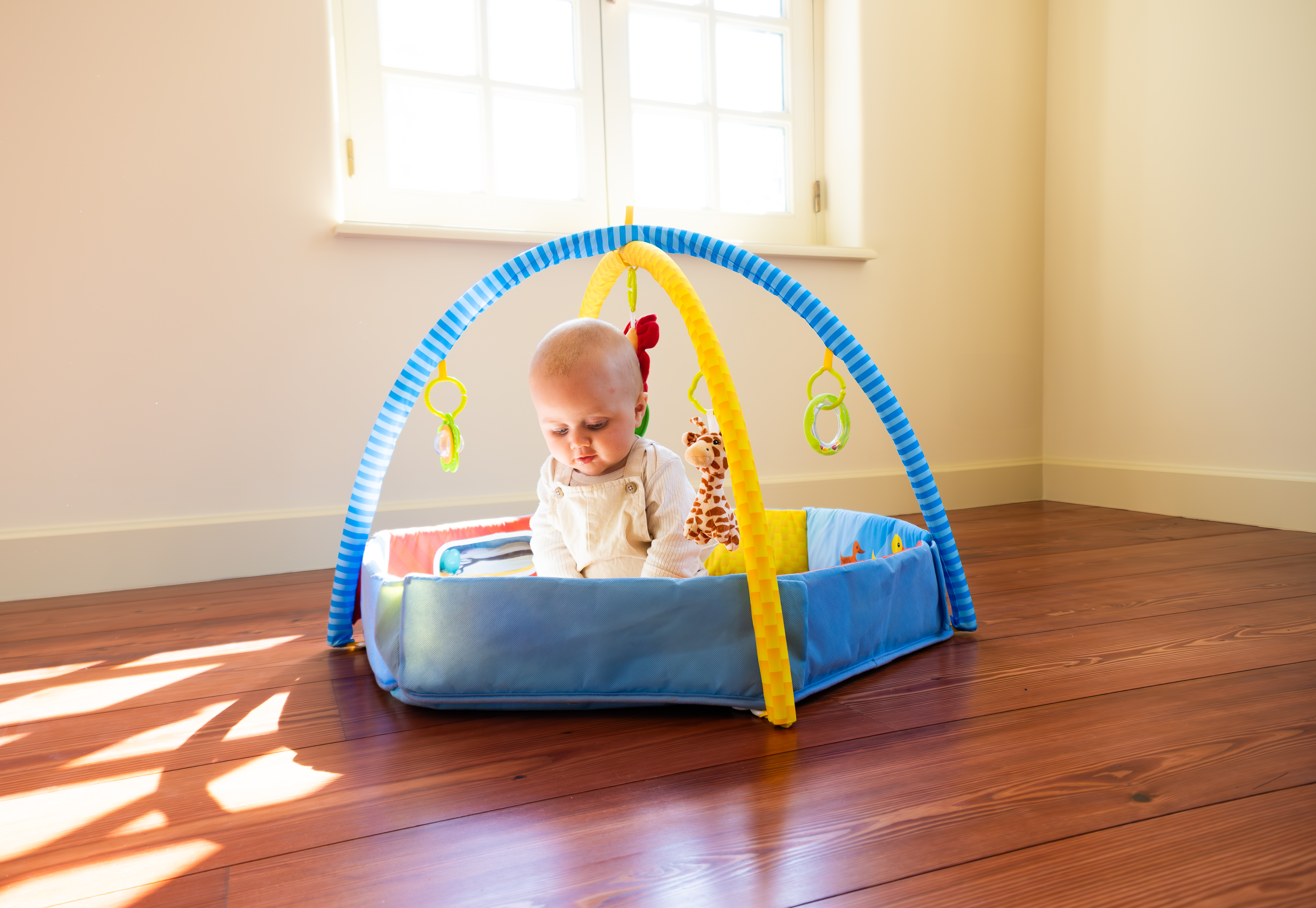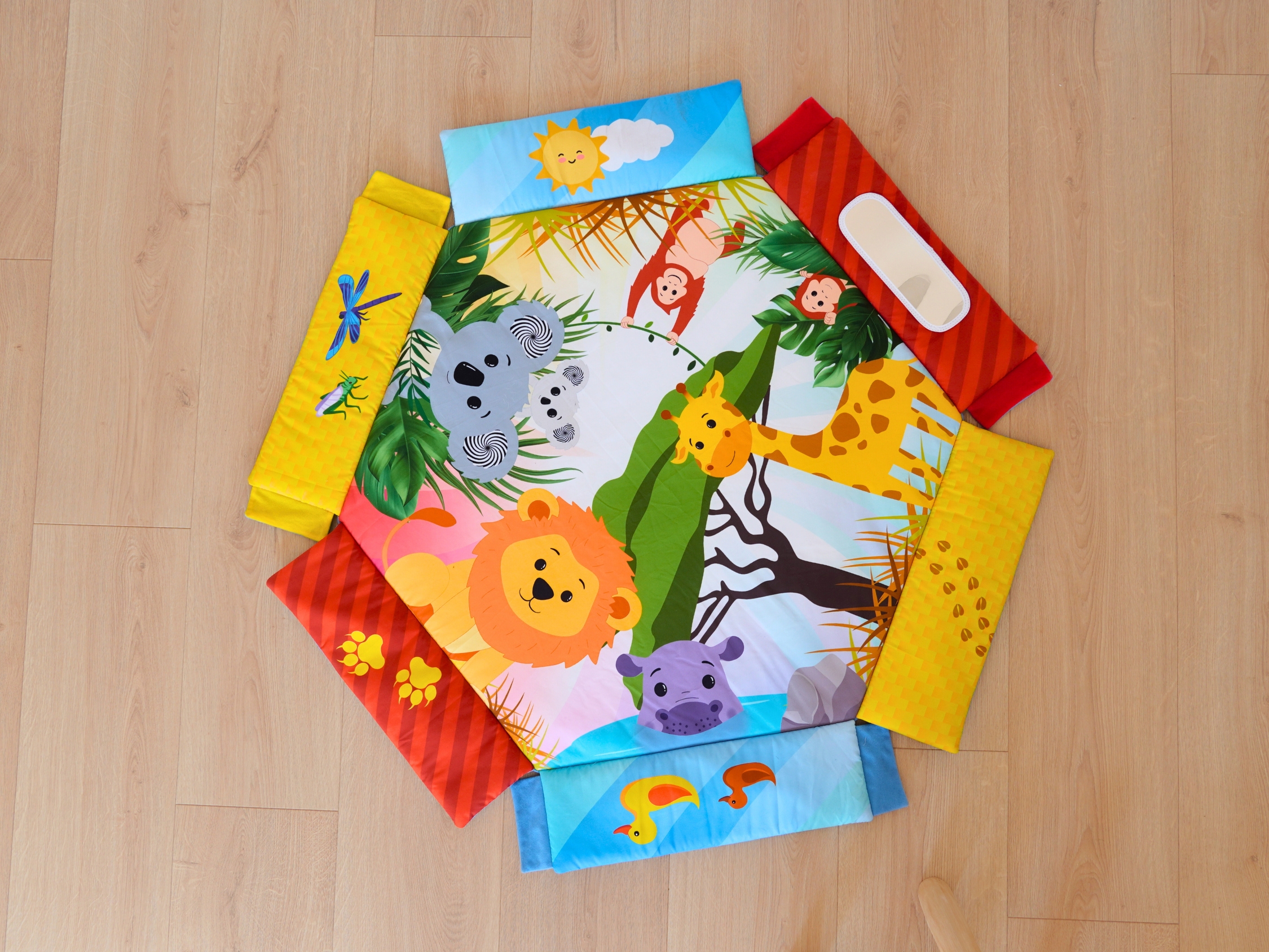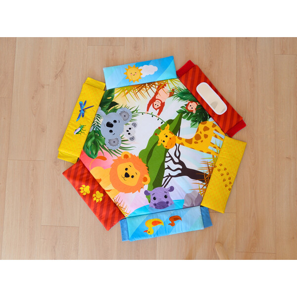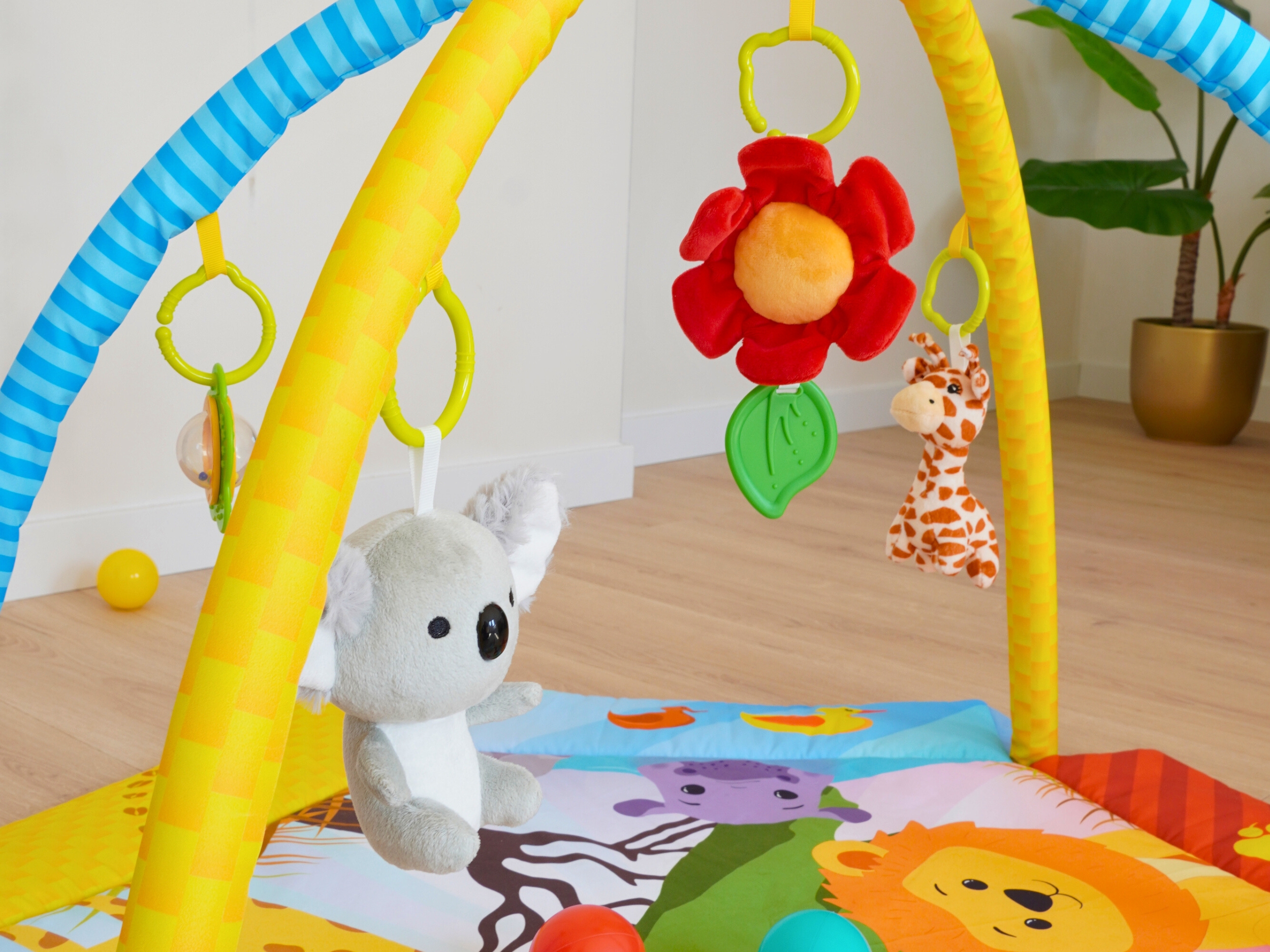 С мек и безопасен дизайн, красиви цветове и 30 цветни топки, вашето бебе ще се забавлява, ще се движи и ще развива уменията си чрез игра. Гимнастиката лесно се трансформира в басейн с топки или в занимателен активити килим.