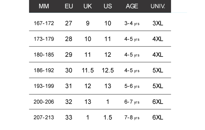 | Милиметри: (дължина на крака) | EU | UK | US | Години | UNIV. |