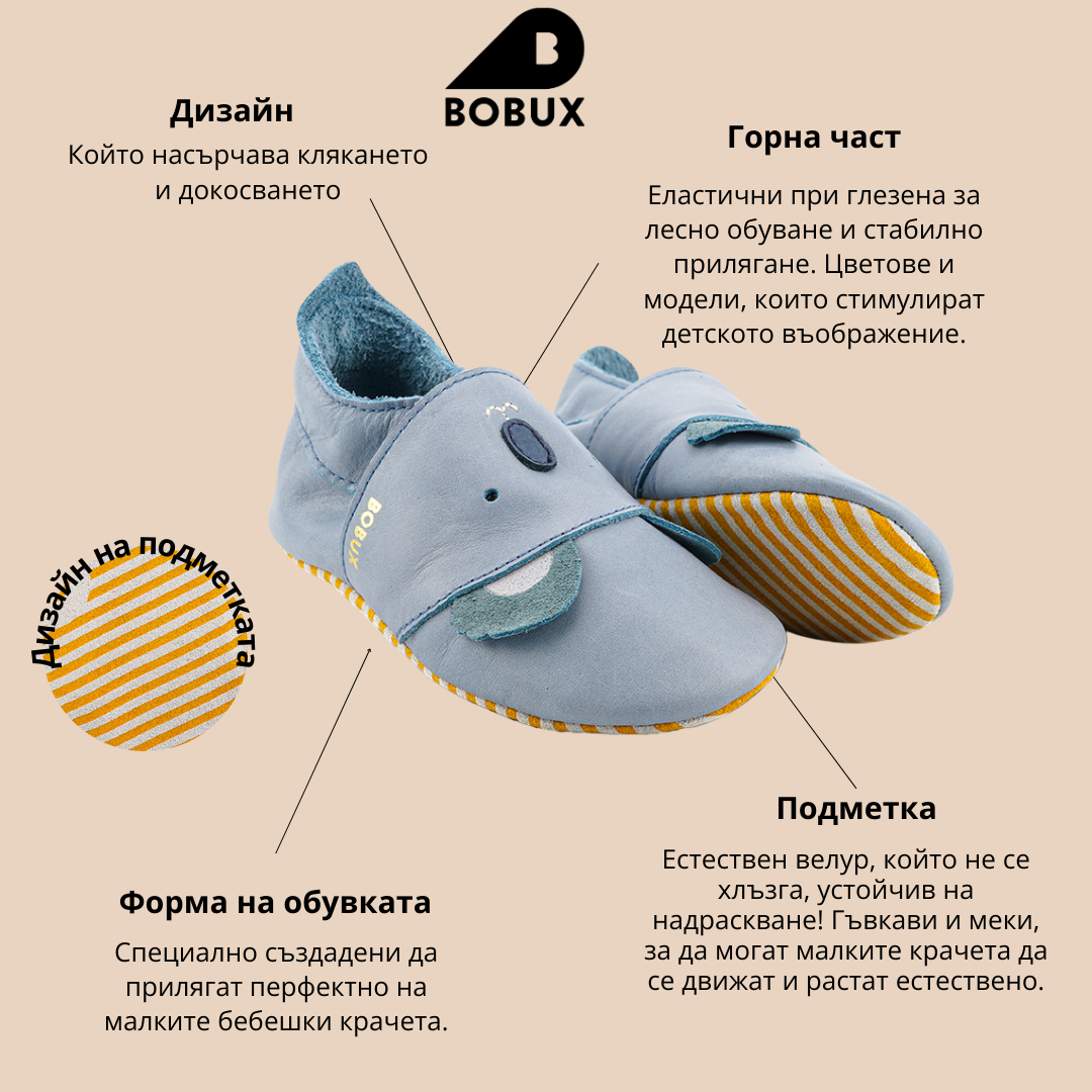 Bobux проектира обувки, които подпомагат здравословното развитие и свободата на движение на бебетата още от първите им стъпки. Bobux Soft Sole са перфектният избор за първото пълзене и стъпване на малкото ви съкровище, осигурявайки комфорт, защита и свобода на всяко движение.