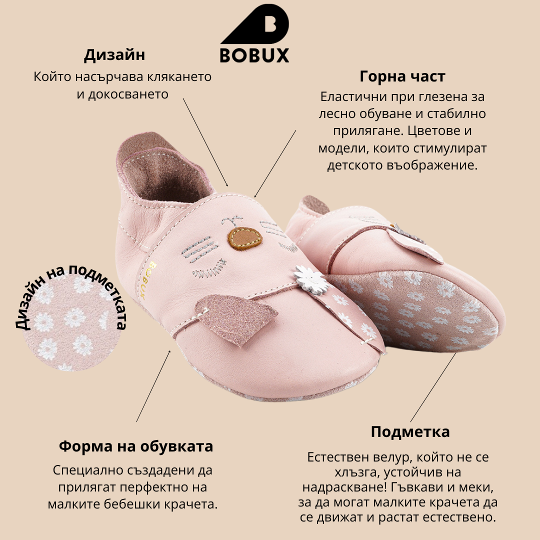 Bobux проектира обувки, които подпомагат здравословното развитие и свободата на движение на бебетата още от първите им стъпки. Bobux Soft Sole са перфектният избор за първото пълзене и стъпване на малкото ви съкровище, осигурявайки комфорт, защита и свобода на всяко движение.