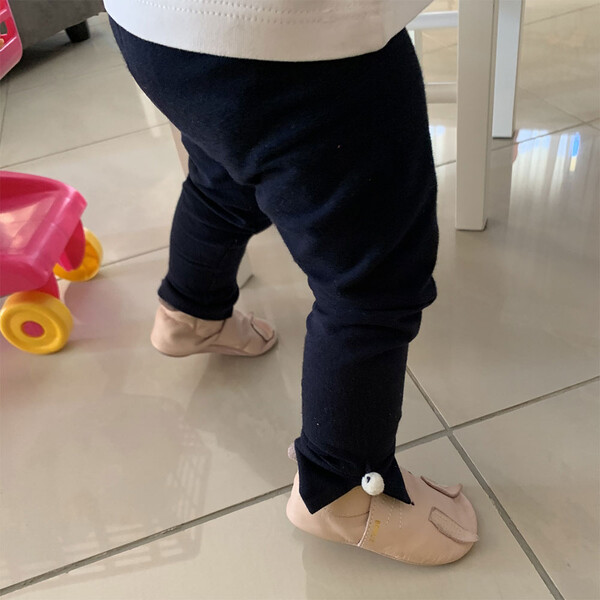 Меката, нехлъзгаща се подметка от велур помага на детето да усеща повърхността, подобрявайки увереността, стойката и баланса му. Двойният шев гарантира стабилност и устойчивост, осигурявайки дълготрайна употреба.