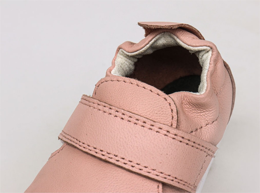 Външната част е изработена от кожа, осигуряваща защита за малките крачета, особено когато се изправят пред голямото предизвикателство – първите стъпки. Благодарение на еластичното велкро закопчаване, обувките се обуват лесно и стоят стабилно около глезена. Подметките от EVA материал са гъвкави и издръжливи, което ги прави идеални за прохождането на малките изследователи.