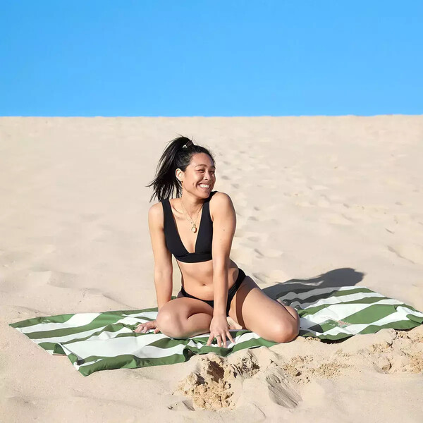 Кърпата за плаж Quickdry Cabana - Cayman Olive Microfiber (микрофибър) в размер Large е перфектният избор за море или басейн, с нейния земен дизайн и качество, което ще обожавате!