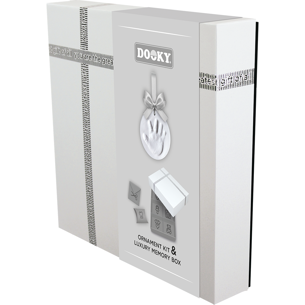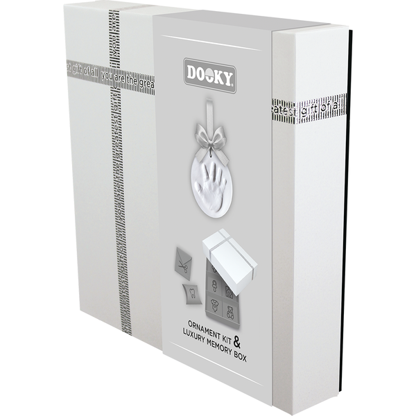 С комплекта Dooky Original Ornament можете лесно да направите глинен отпечатък от ръчичка или краче на вашето мъниче, който ще остане за цял живот. Луксозната кутия за спомени със сребърна релефна панделка предлага място за бебешки сувенири като залъгалка, кичур за коса, зъб, гащеризон и др. Включва разделители, кутийка за зъби и друга за кичур за коса.