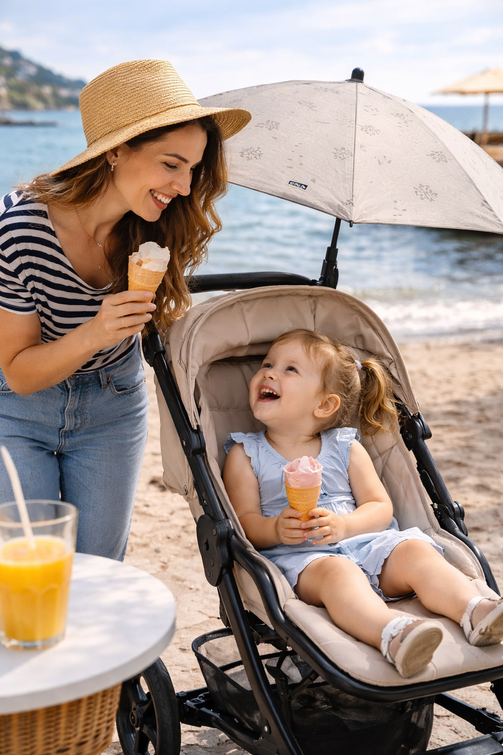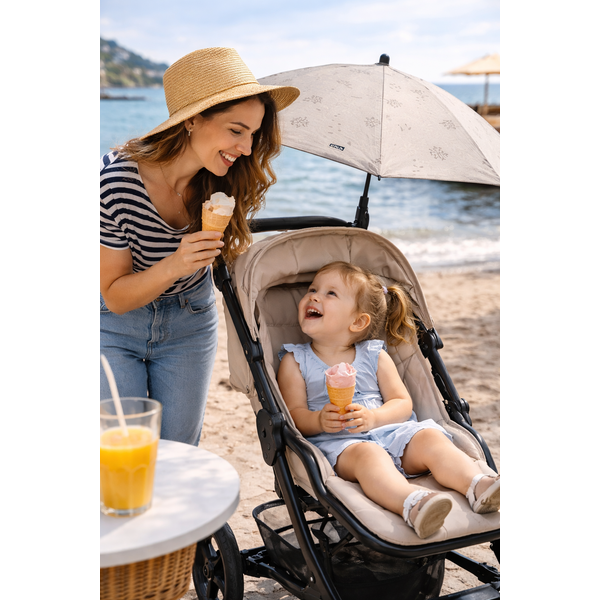 Има сенник с UPF 50+ защита и голям диаметър 76 см, така че да покрива голяма част от количката.