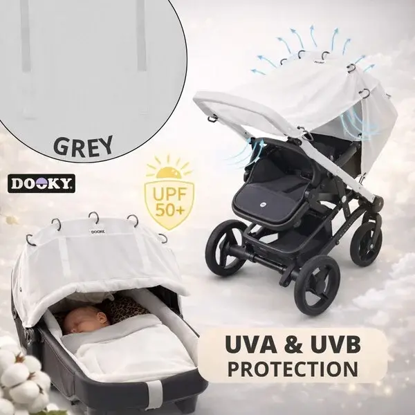 Универсалният сенник Dooky Universal Cover е тук, за да ви даде точно това, от което имате нужда: спокойствие, безопасност и комфорт за вашето дете, без да се притеснявате от слънчевите лъчи.