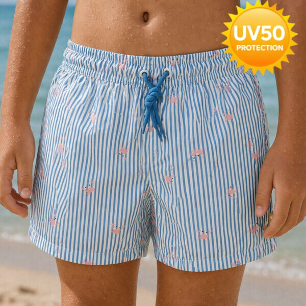 UV50+ защита от слънцето помага да се предпази чувствителната детска кожа, а материята съхне бързо, за да остане удобна и след къпане.