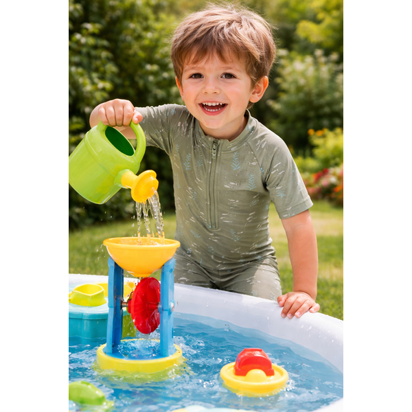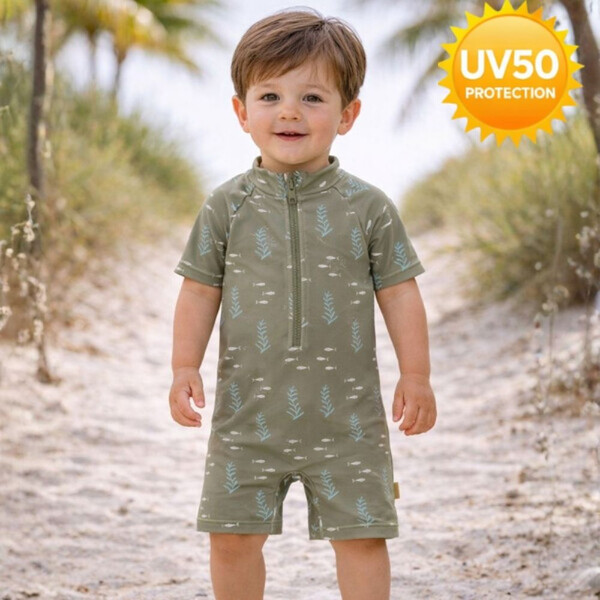 UV 50+ защита се грижи за чувствителната детска кожа, за да може детето да играе спокойно под слънцето. Материята е мека, лека и приляга удобно към тялото, без да ограничава движенията.