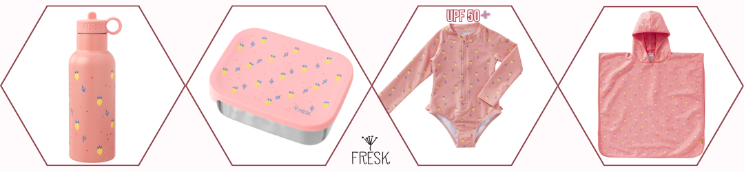 - Състав на материала: Банските на Fresk са изработени основно от рециклиран найлон – издръжлив и мек материал. Тази устойчива материя се използва за създаване на екологични бански за деца и това ги прави еко алтернатива на стандартните бански костюми.