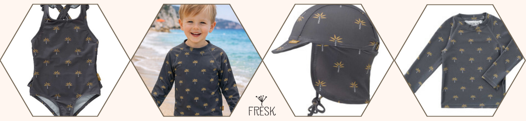 - Състав на материала: Банските на Fresk са изработени основно от рециклиран найлон – издръжлив и мек материал. Тази устойчива материя се използва за създаване на екологични бански за деца и това ги прави еко алтернатива на стандартните бански костюми.