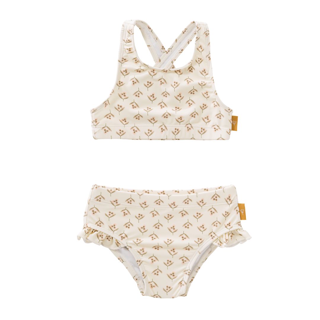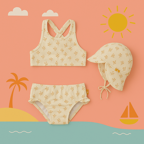 Открийте прекрасния комплект Fresk „Olives“ — бикини бански и Legionnaire шапка, създадени с любов към децата и природата