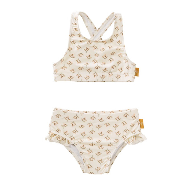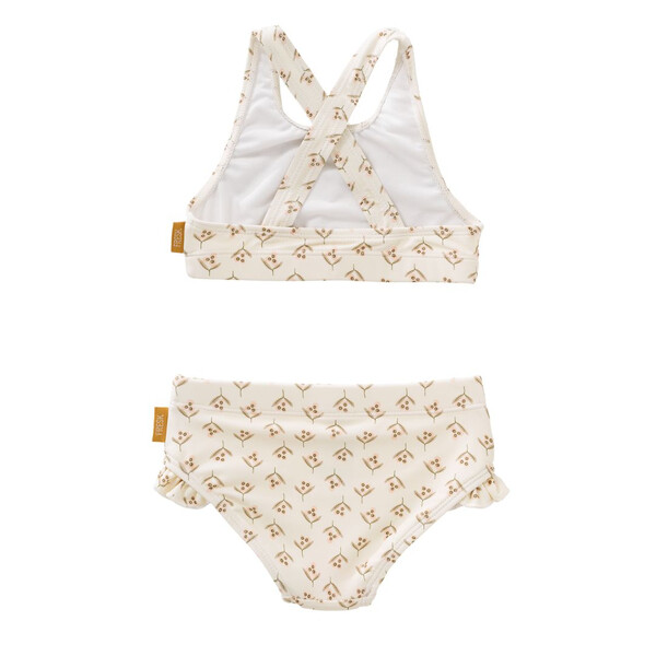 Детското бикини на Fresk предлага комфорт, безопасност и уникална визия, благодарение на стабилното прилягане и кръстосаните еластични презрамки, които държат банския на място. Изработено е от рециклирани, екологични материали, които съхнат бързо и са нежни към детската кожа.