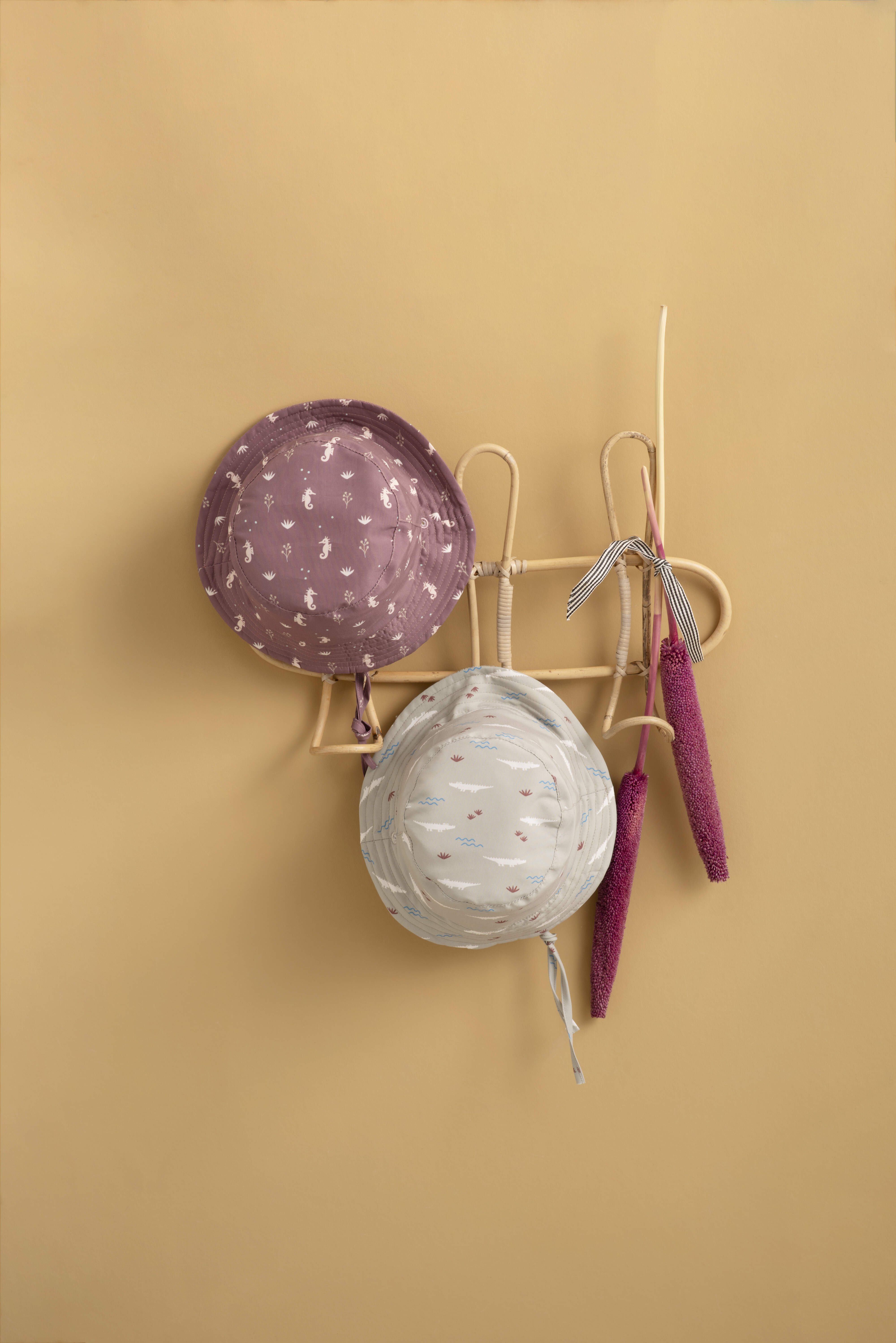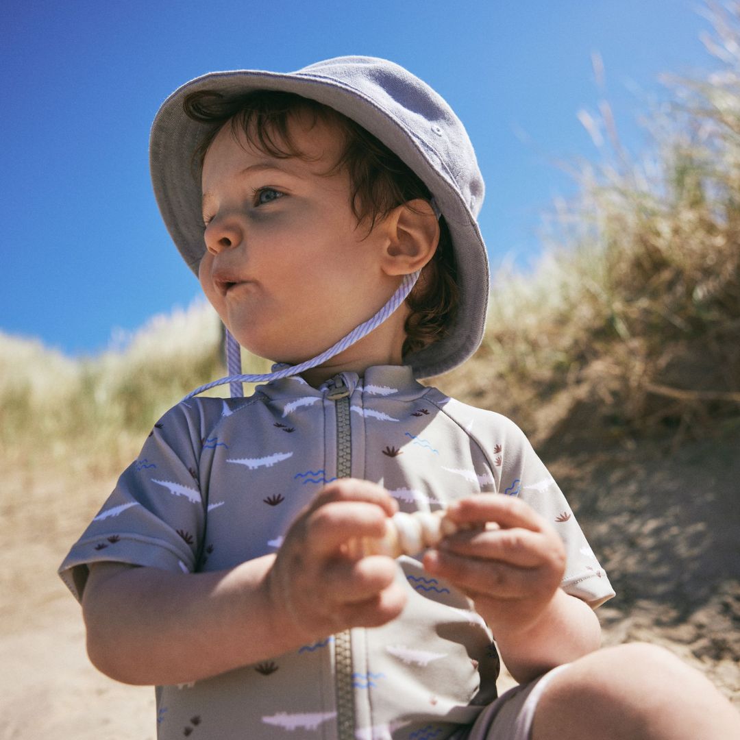 Тази детска текстилна шапка тип bucket покрива по-голямата част от главата и има периферия по цялата ѝ обиколка. Благодарение на слънцезащитния текстил, от който е изработена, тя сигурява защита от вредните слънчеви лъчи (UVA-UVB), като ефективно предпазва кожата на вашето дете.