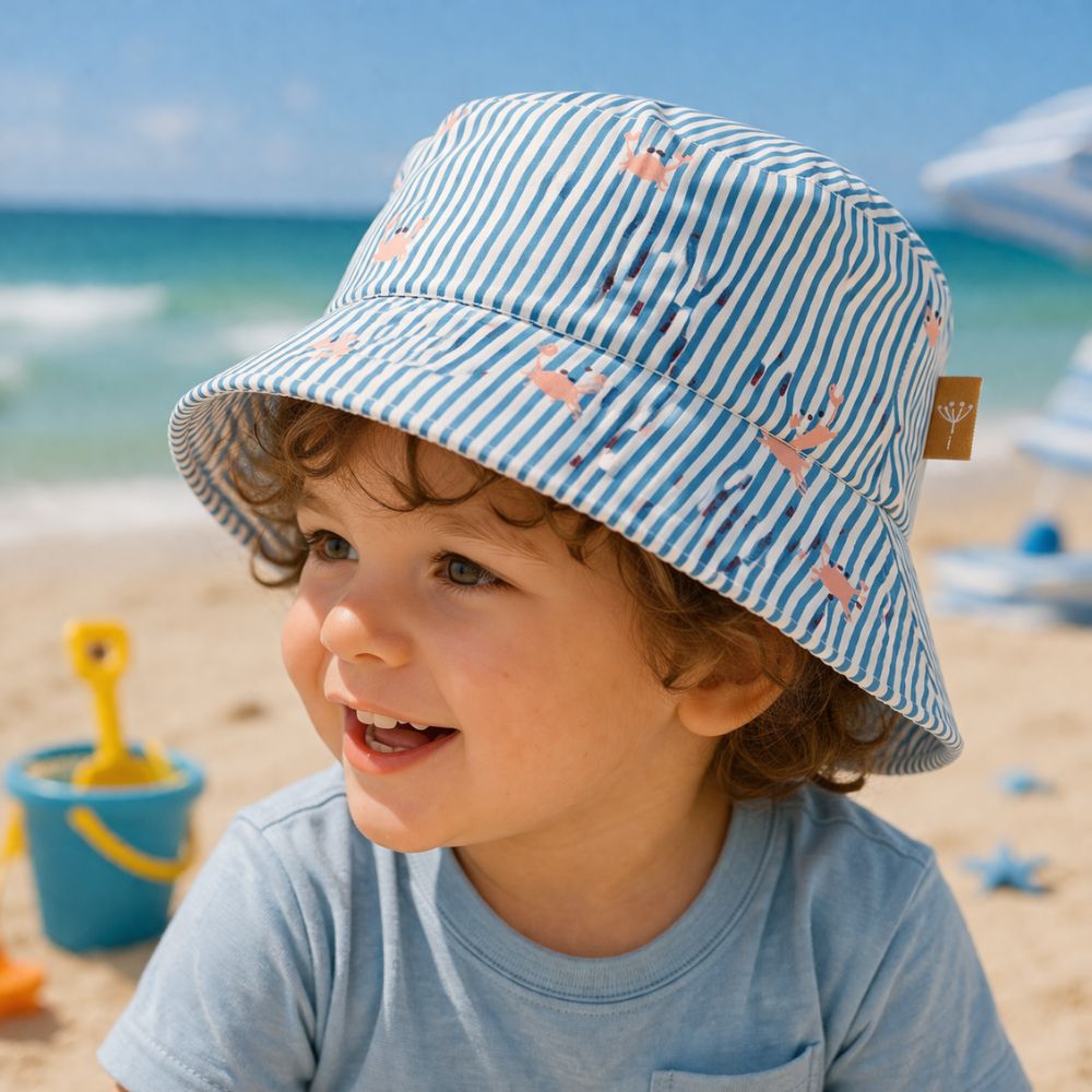 Тази детска текстилна шапка тип bucket покрива по-голямата част от главата и има периферия по цялата ѝ обиколка. Благодарение на слънцезащитния текстил, от който е изработена, тя сигурява защита от вредните слънчеви лъчи (UVA-UVB), като ефективно предпазва кожата на вашето дете.